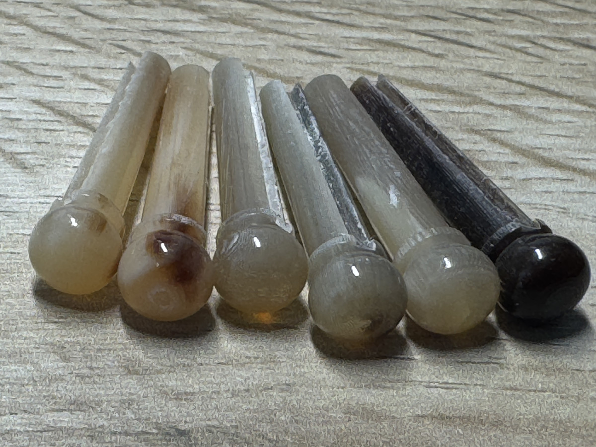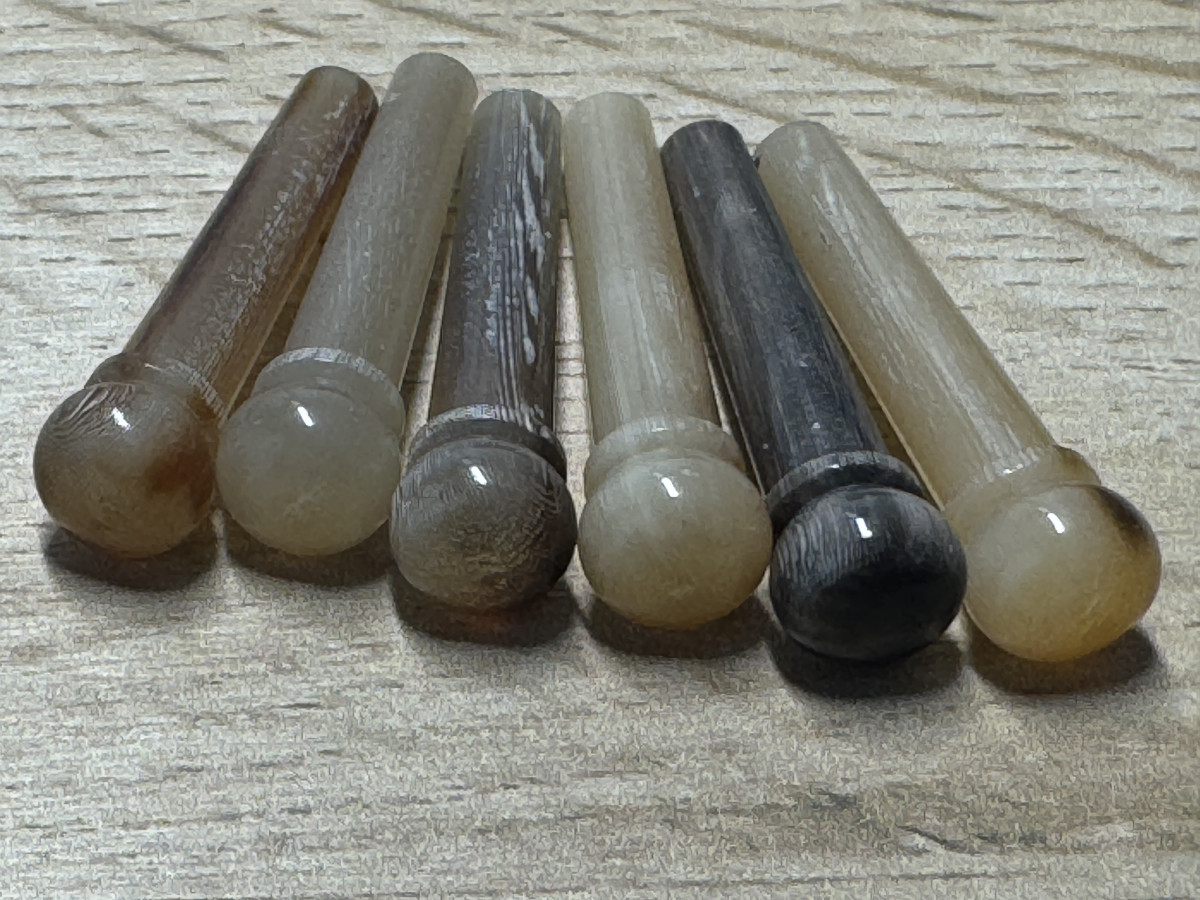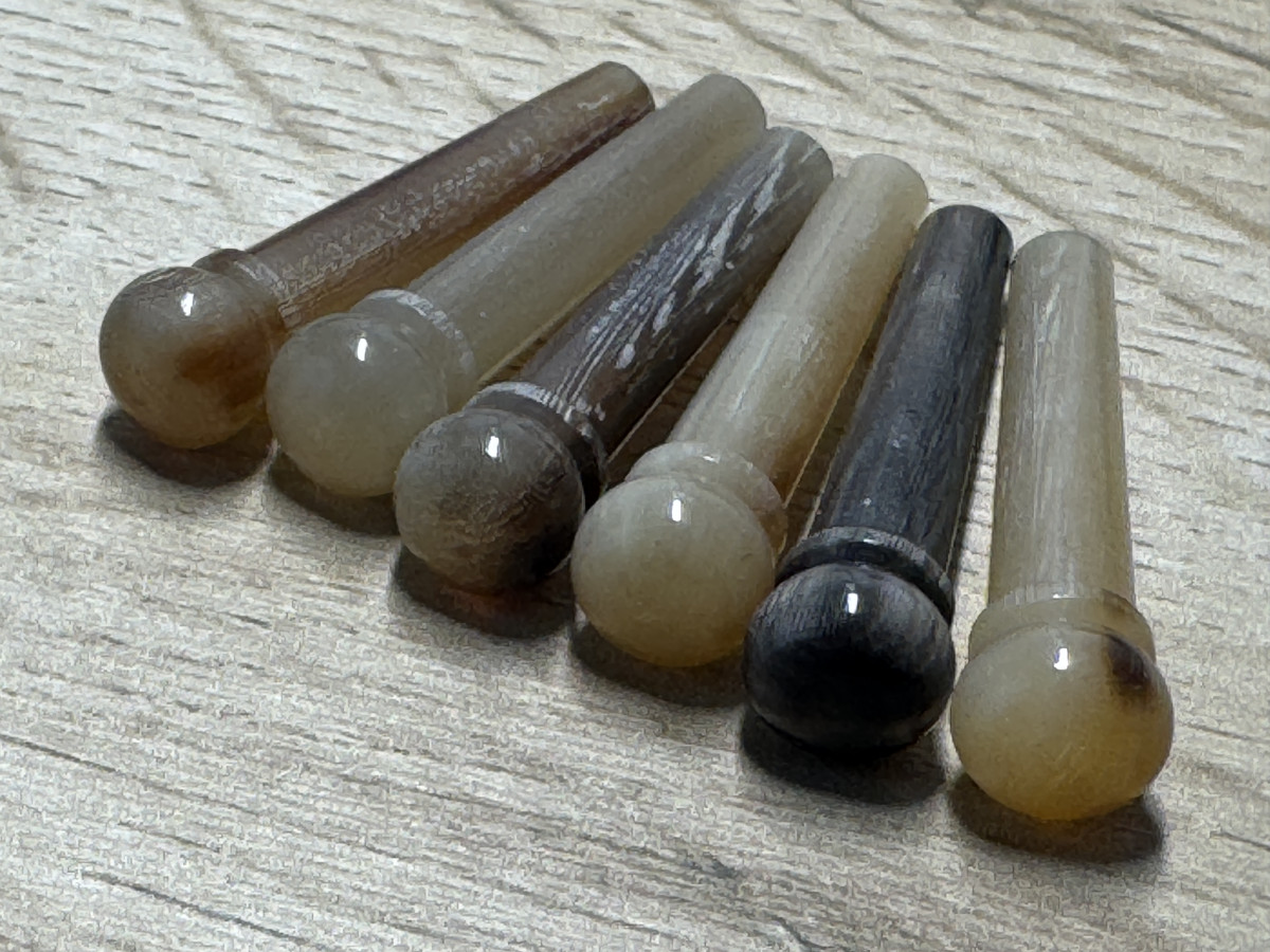 Fabricados artesanalmente en cuerno de buey , estos pines de puente ofrecen una combinación única de estética elegante y rendimiento acústico. A diferencia de los pines plásticos estándar, el cuerno aporta una mayor transmisión de vibraciones, mejorando la resonancia y el sustain del instrumento