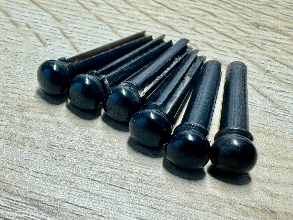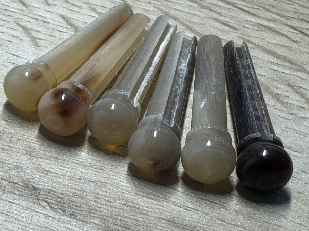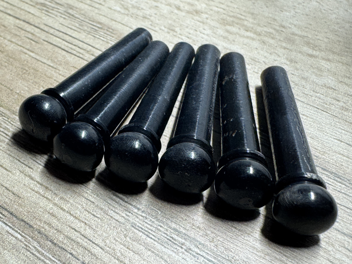 Fabricados artesanalmente en cuerno de buey , estos pines de puente ofrecen una combinación única de estética elegante y rendimiento acústico. A diferencia de los pines plásticos estándar, el cuerno aporta una mayor transmisión de vibraciones, mejorando la resonancia y el sustain del instrumento