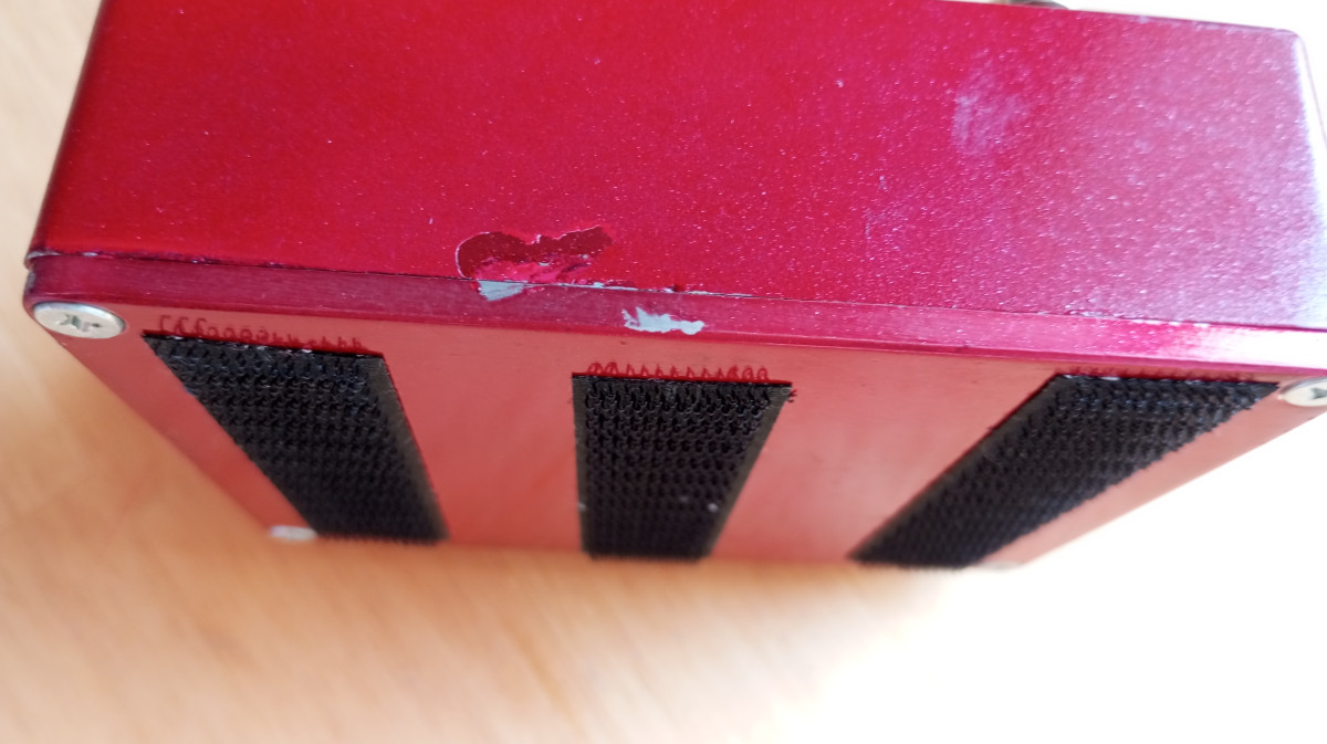 Funciona perfecto, tiene un pequeño desperfecto en la pintura en un lateral y lleva velcro en la base.