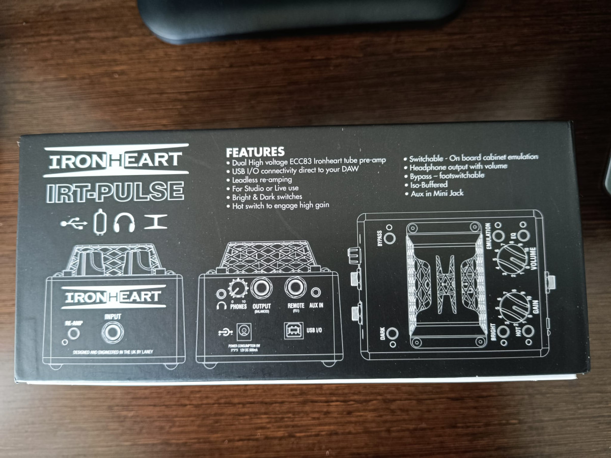 Laney IRT Pulse preamplificador valvular con un par de válvulas ECC83/12AX7 de la serie Ironheart del tamaño de un pedal. Muy versatil se puede utlizar tanto en escenario, en casa y en el estudio, tiene una interfaz de audio USB incorporada un emulador de cabina analógica y equalizacion, tambien tiene la opcion de volverlo mas oscuro o mas brillante, y Gain con tonos de alta ganancia y sonidos clásicos de rock, blues o country.