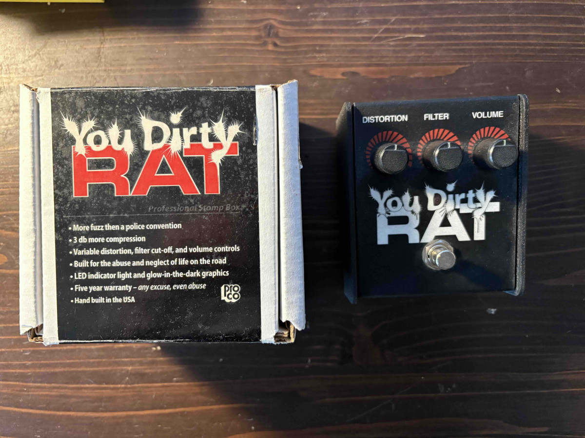 Pedal de distorsión para guitarra eléctrica ProCo You Dirty RAT. Versión más potente del RAT clásico, con mayor ganancia y carácter más agresivo. Incluye el famoso filtro RAT para afinar el tono. Válido desde overdrive fuerte hasta distorsión saturada.