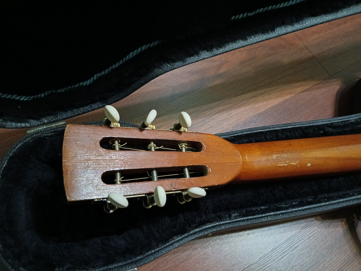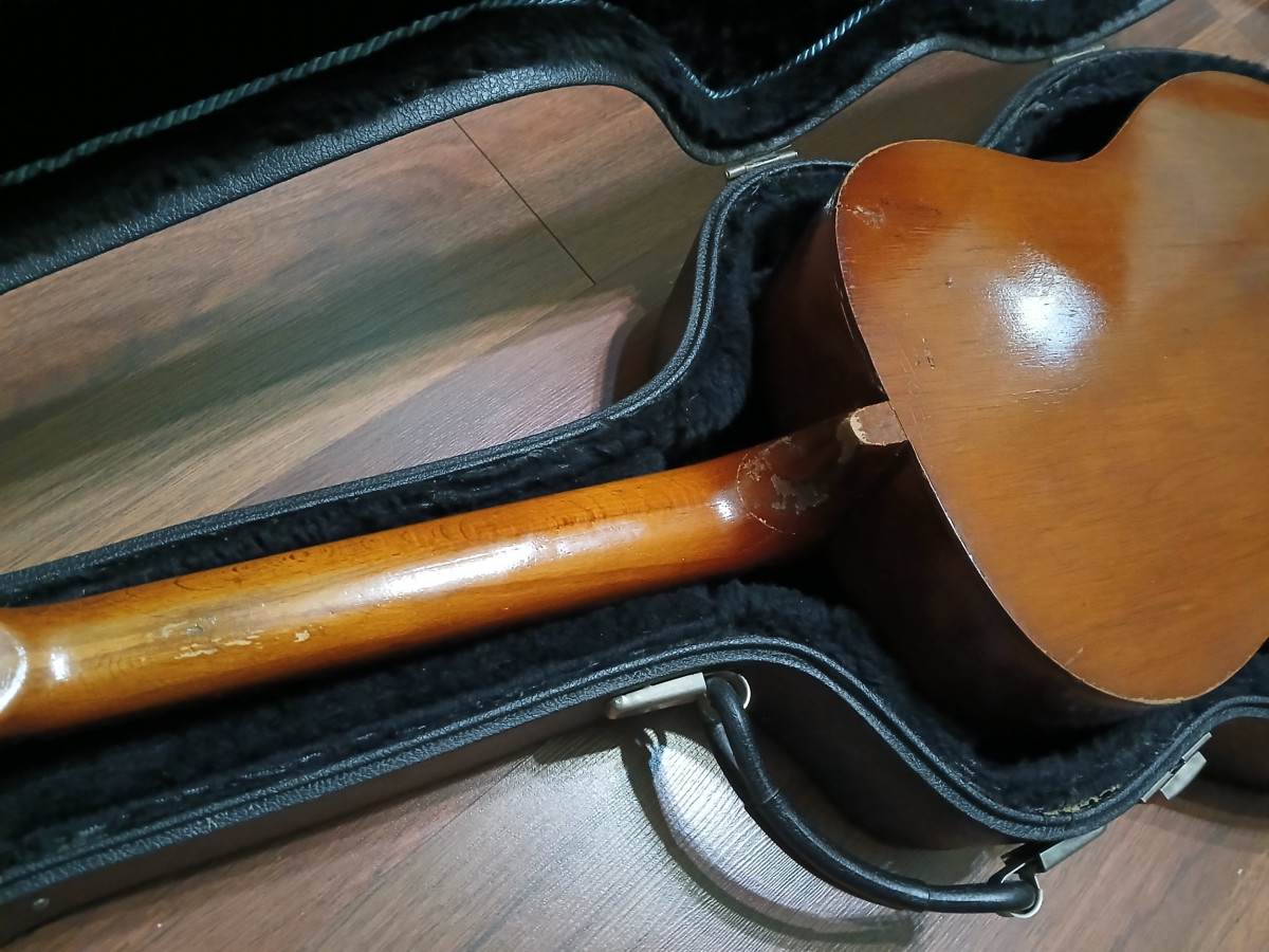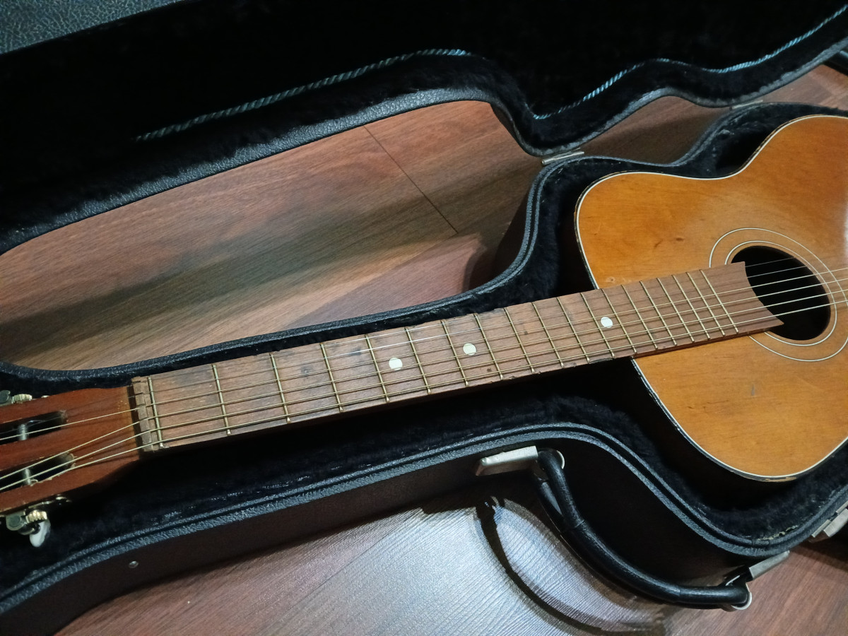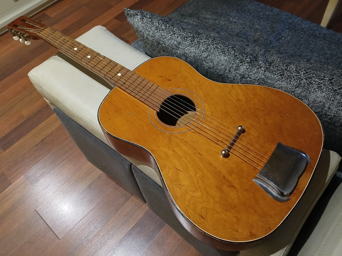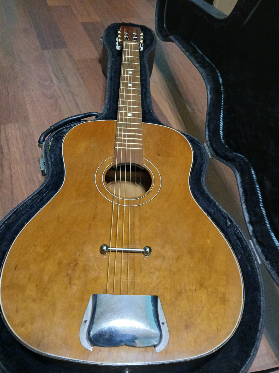 Guitarra acústica estilo Parlor de los años 60, fabricada en Polonia. Probablemente DEFIL. Es un proyecto con un estilo único. Cordales de latón cromado oculto bajo ashtray Greco, ambos japoneses de los 70s. Puente de diseño propio.Clay dots, traste 0, trastes de latón, Clavijero nuevo de bronce con palometas crema (se entrega el original deteriorado) Signos de la edad. Diapasón hidratado.Trastes recoronados. Estuche Worcester de los años 60s con ribete interior. Solo el case y hardware, ya vale lo que pido. Trato en mano en Jaén o cerca. Precio innegociable. Solo cambio por bigsby b7 dorado o estuche Gibson custom shop.