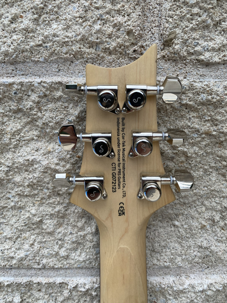 Por exceso de material vendo esta PRS algo modificada: le puse clavijas schaller de bloqueo y se le ha modificado la electrónica para tener 1 volumen por pastilla, y la posición intermedia actúa como coil split. Por supuesto, todo reversible. Estéticamente está perfecta, ni un solo toque. Afinada en drop A.