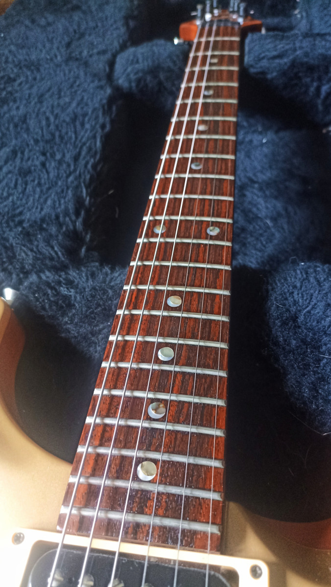 La guitarra está en un estado maravilloso para su edad con únicamente un par de marcas insignificantes, trastes en perfecto estado. La maleta si está bastante currada pero totalmente funcional.