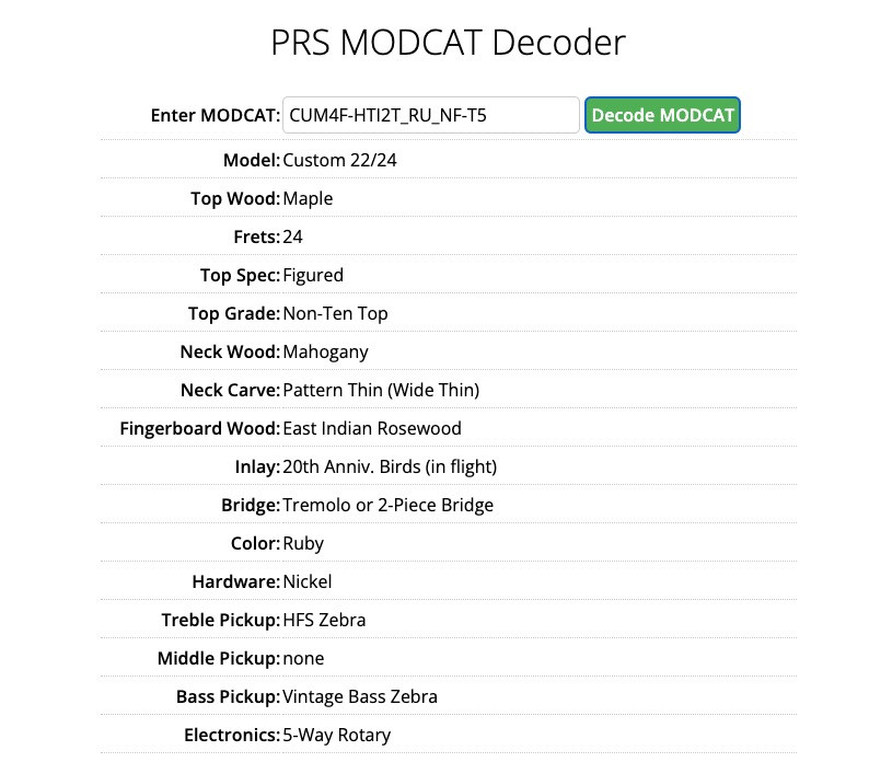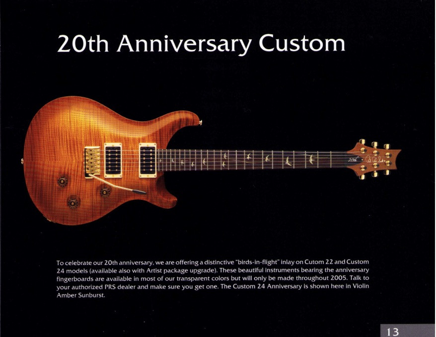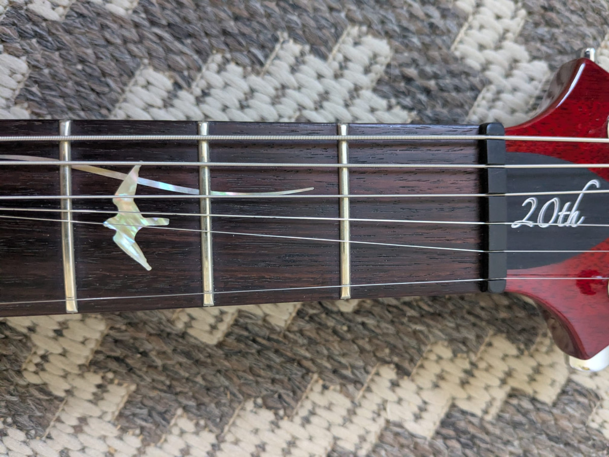 Un detalle especial son los pájaros incrustados en el diapasón de palisandro, exclusivos del 20.º aniversario de PRS asi como la tapa del alma con el logo del 20th . El perfil del mástil es Wide Thin. La electrónica incluye controles de volumen y tono, así como un selector rotativo , rotary switch de 5 posiciones. También incorpora las pastillas HFS y vintage Bass típicas de la época.