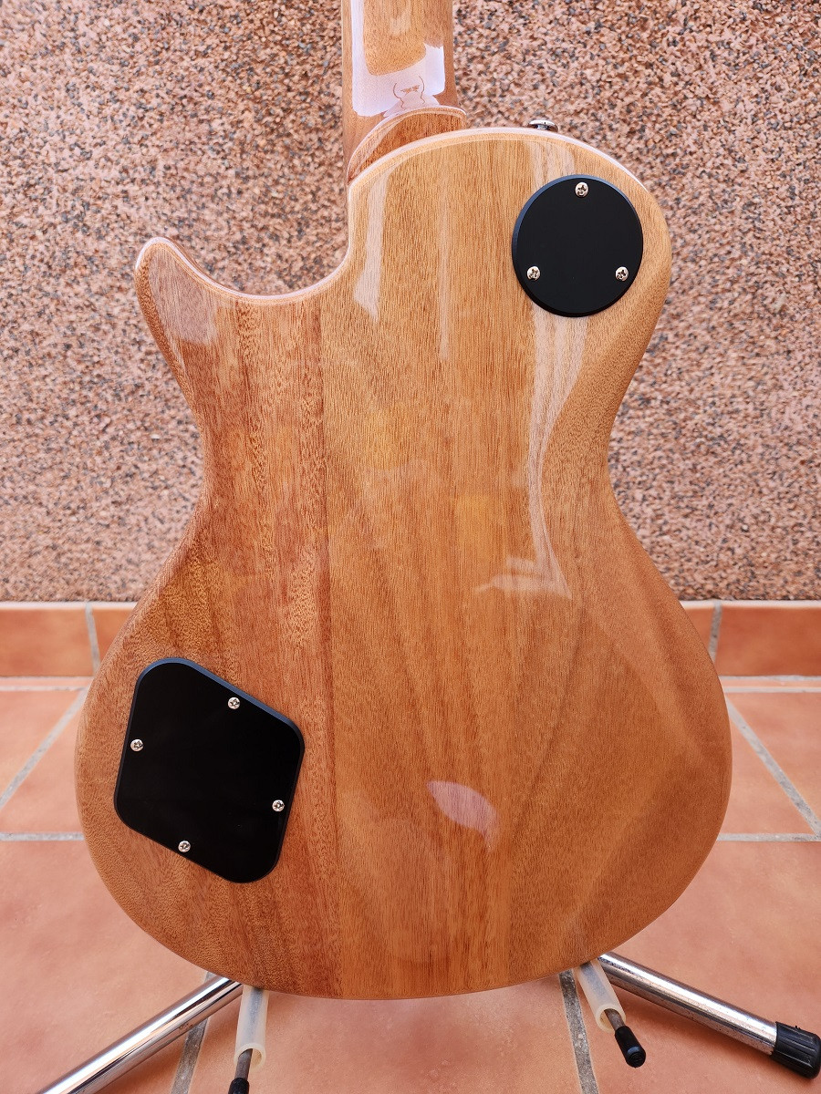 Cuerpo de caoba y tapa de arce arqueada con lámina de arce flameado.