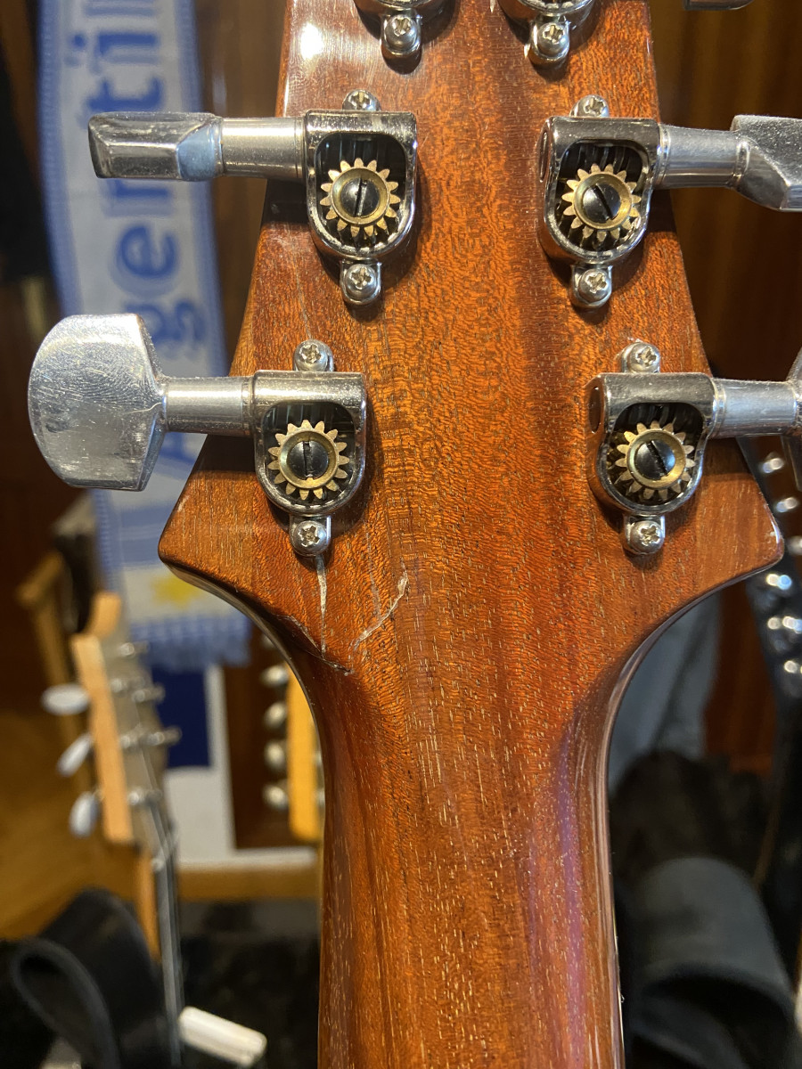 Tiene una grieta súper pequeña en la pala detrás del afinador de la sexta cuerda. Está reparada por luthier y ni se nota.