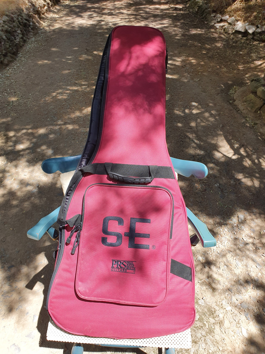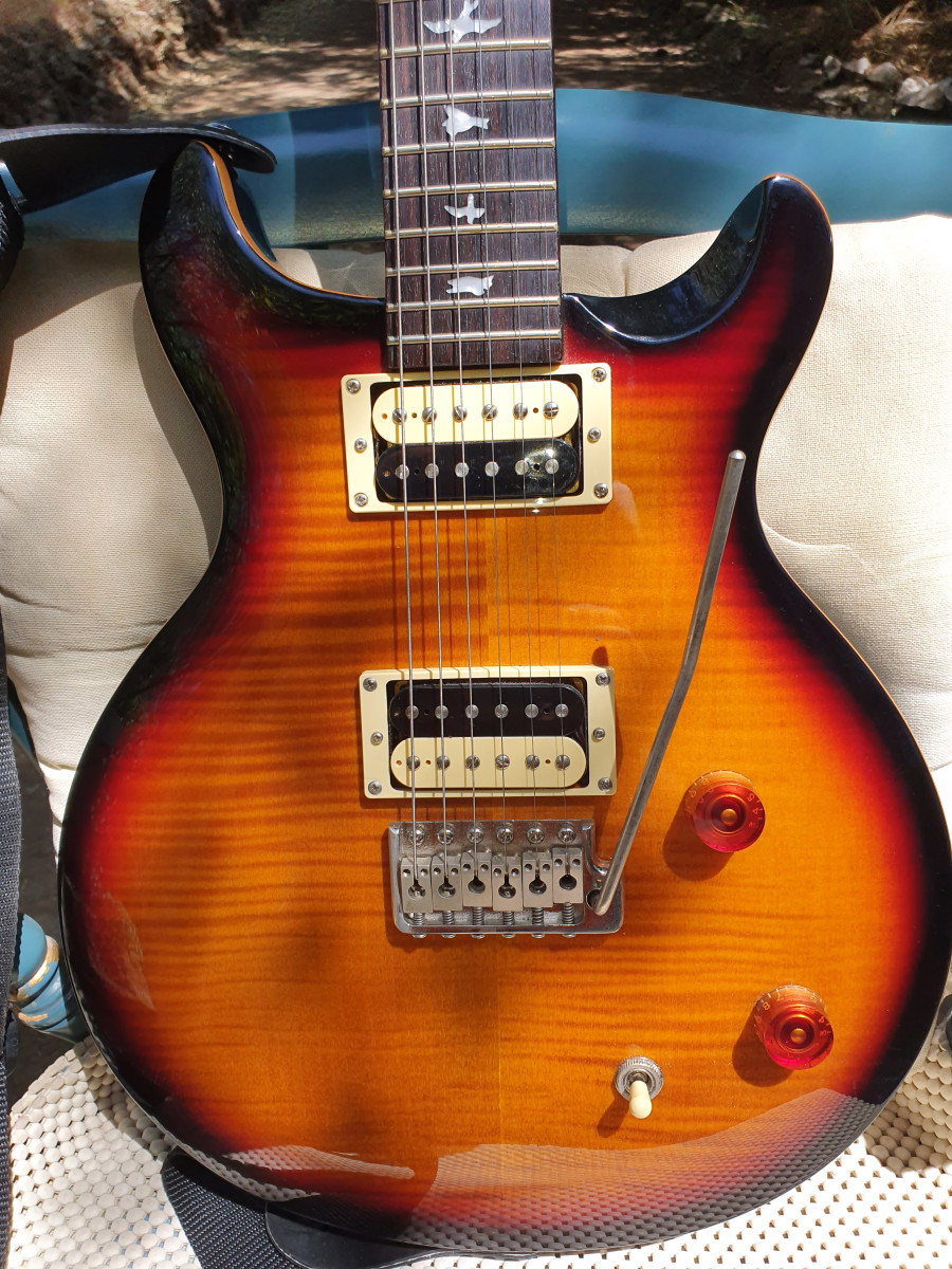 Guitarra eléctrica PRS SE Santana en acabado Sunburst. Está en muy buen estado y luce preciosa. Absolutamente impecable. Comprada para colección, sin uso profesional, tocada una docena de veces en casa, siempre en funda. Modelo Signature Santana, cuerpo de caoba, tapa de arce, mastil de caoba, diapasón de palorosa, 22 trastes, escala 24.5, clavijeros PRS, incrustracciones de pájaros en el mástil, puente PRS tremolo, funda PRS roja.