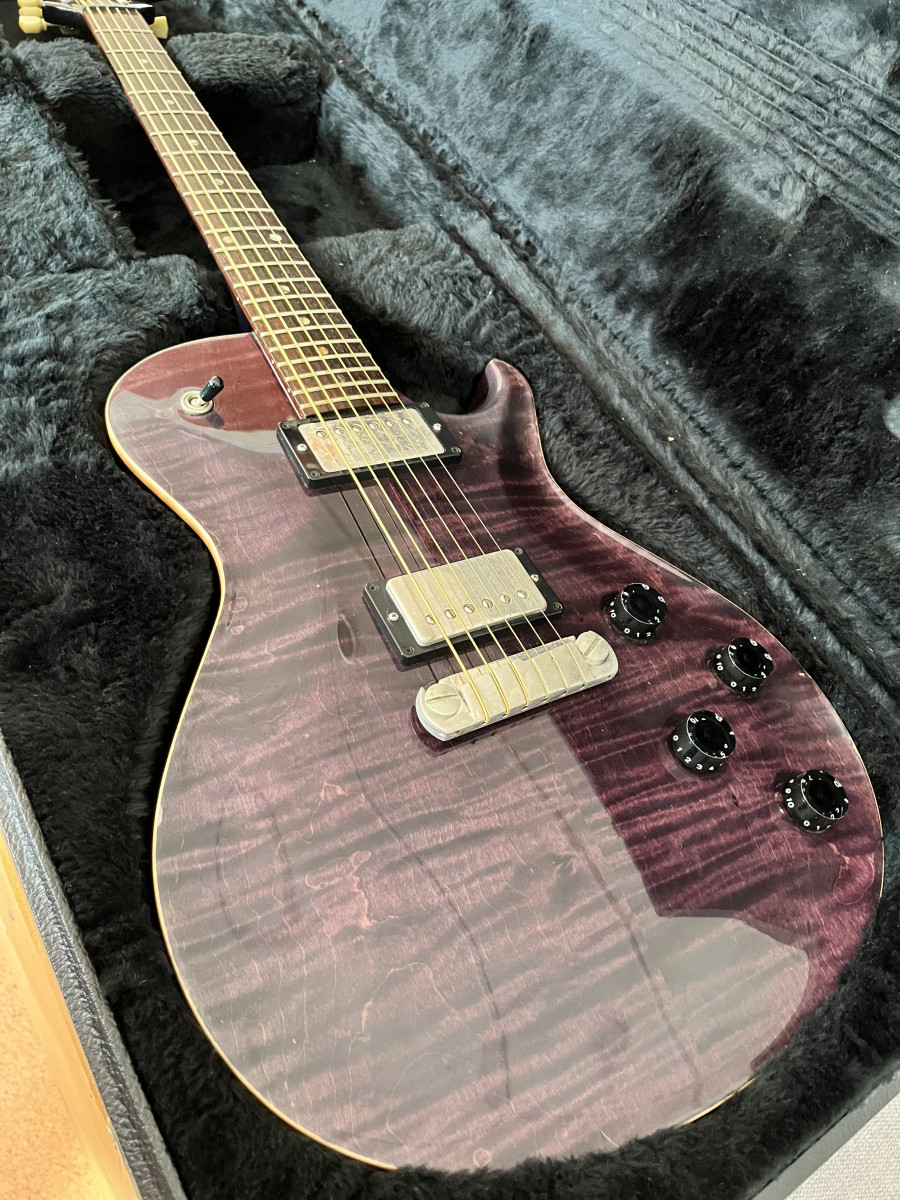 Es una PRS pre lawsuit del 2001 en acabado morado con una tapa de miedo. Lleva lunas en el mástil, que es el fat, el más grueso, y pastillas Prs 7, toda original. Tiene algunas marcas de uso, pero para su edad está genial.