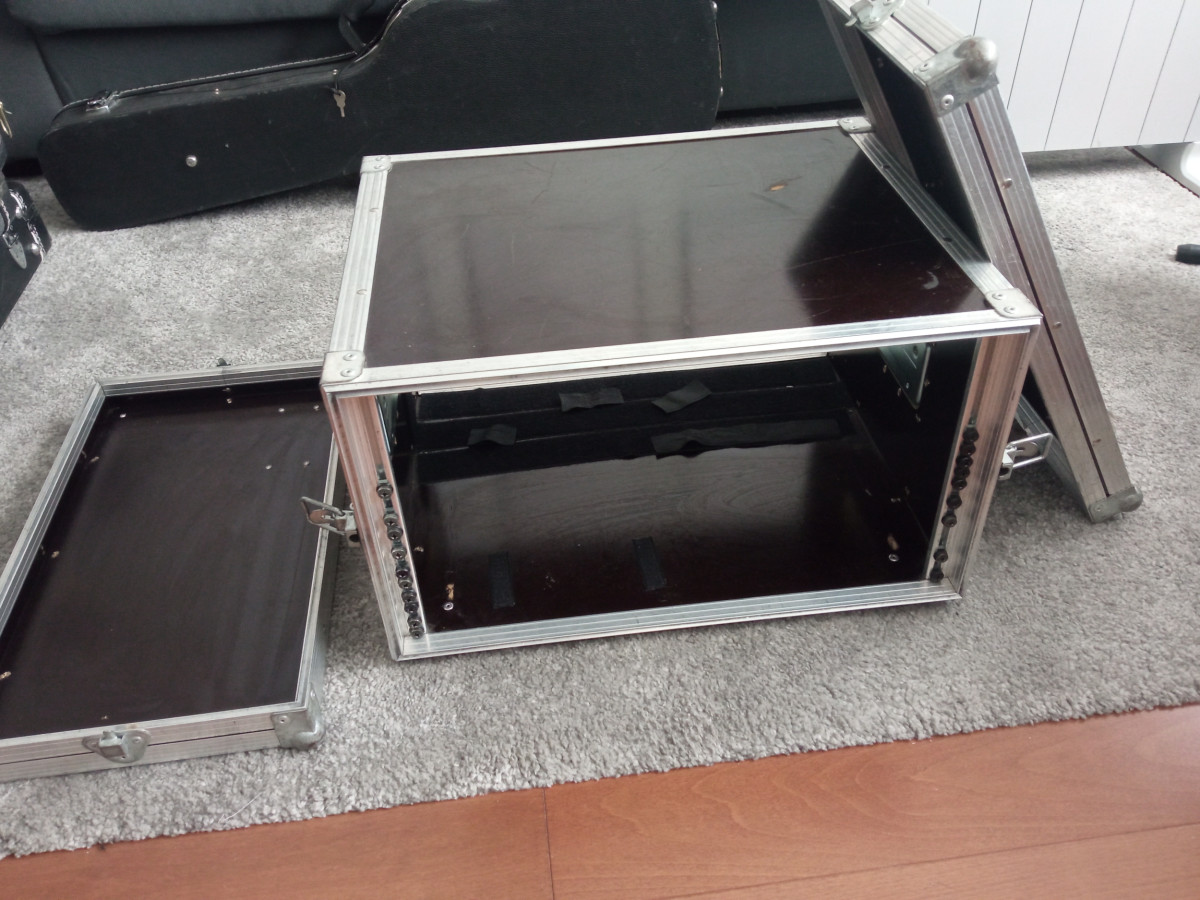 Rack case de 6 unidades de madera. 49 c.m de profundidad total. Marcas de uso pero cierra perfectamente