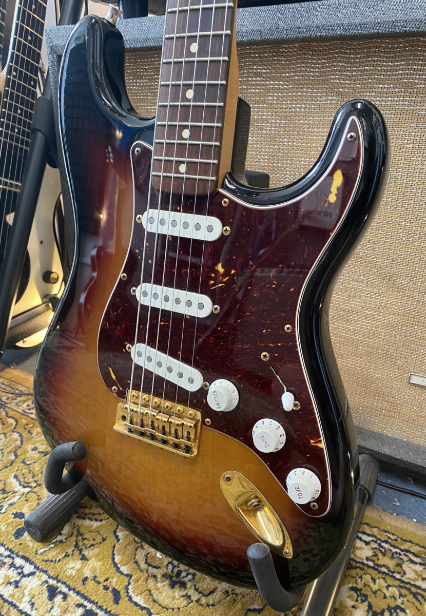 Made in USA. Diapasón de pauferro y radio 12". Mástil bastante generoso. Trémolo con la palanca de zurdos tipo Hendrix. Con pastillas Lollar Blackface y golpeador tortoise. Estuche Cibeles no orginal. Sonidazo Texas Blues. 1800 €.