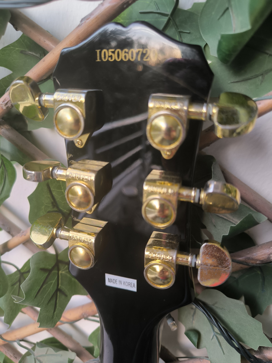 La guitarra suena muy bien, se toca muy bien y luce espectacular, con ligeros signos de uso (algún desgaste en el dorado, sobre todo de la pastilla central) pero sin ninguna rotura o reparación, trastes en excelente estado.