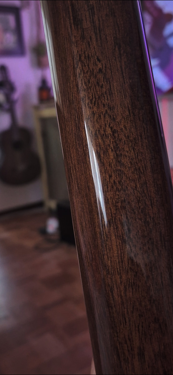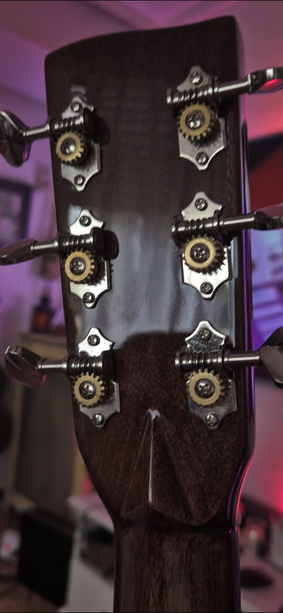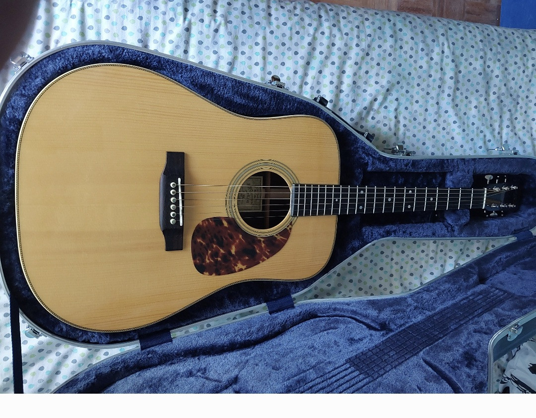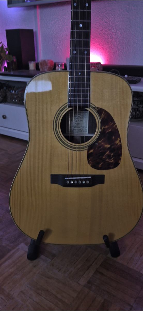 Totalmente sólida, una preciosa tapa solida de abeto de Adirondack d3 grano fino de mas de 30 años, aros y fondo rosewood macizo, mastil en v y diapason y puente de rosewood, suena como una Martin, muy cómoda y resonante, cejilla selleta y pines de hueso.