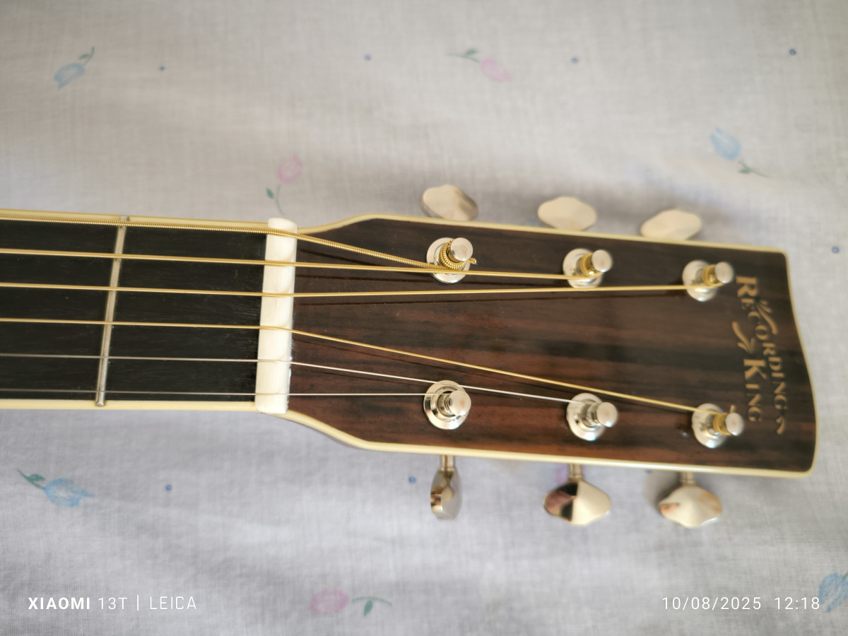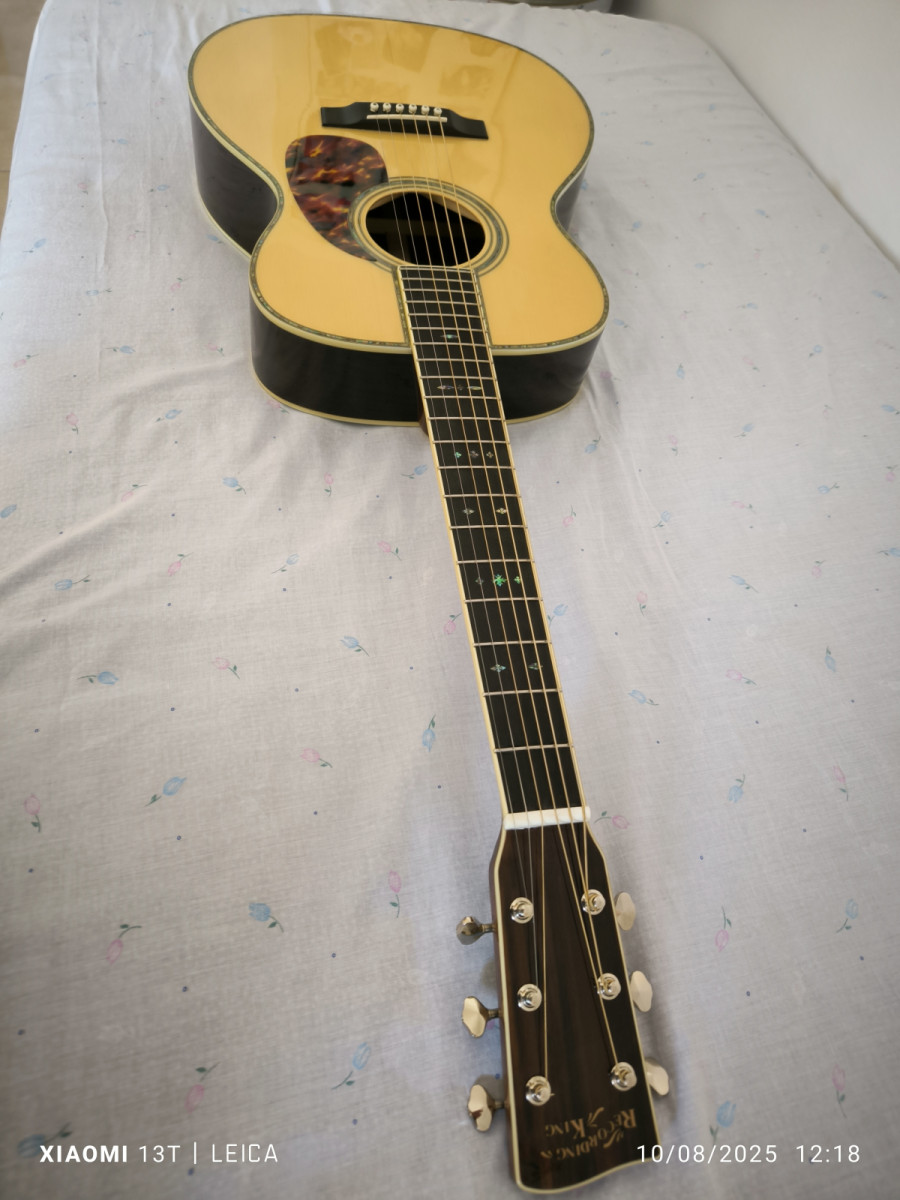 Para quien no la conozca, se trata de una copia de una Martín 000-42 de calidad PROFESIONAL. Fabricada en China sí, pero en fábrica propia, diseñada en USA por la gente de Recording King, que son antiguos trabajadores de Martin y de Gibson, que hacen guitarras orientadas al mercado americano y a los músicos de Bluegrass y de country, con un control de calidad para estos modelos excepcional