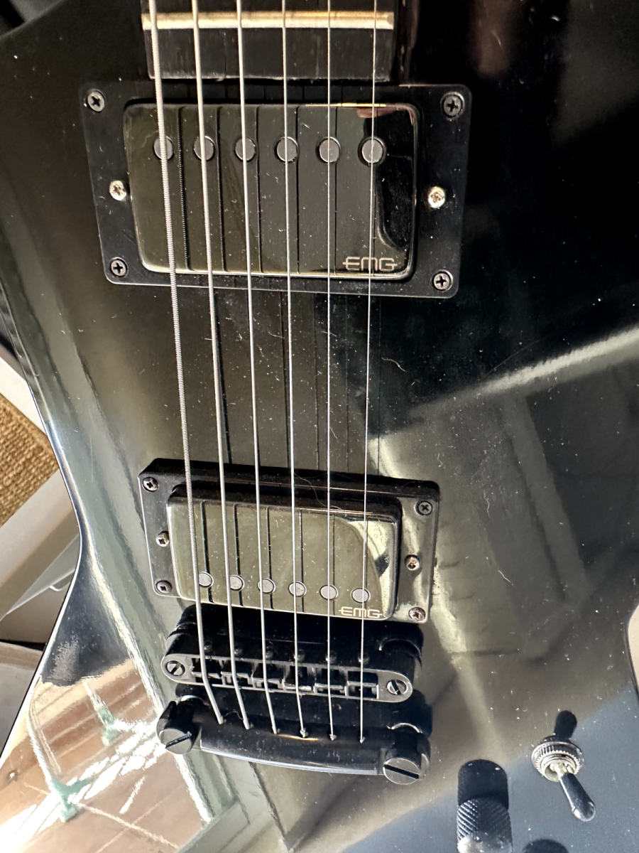 Cuerpo y mástil de caoba, diapasón de ébano. Puente y cordal Gotoh, clavijeros de bloqueo Schaller, y pastillas EMG JH. El toggle switch es también el de EMG, la cejuela es una Graphtech. El mástil está un poco lijado por detrás para eliminar el tacto pegajoso de la laca.