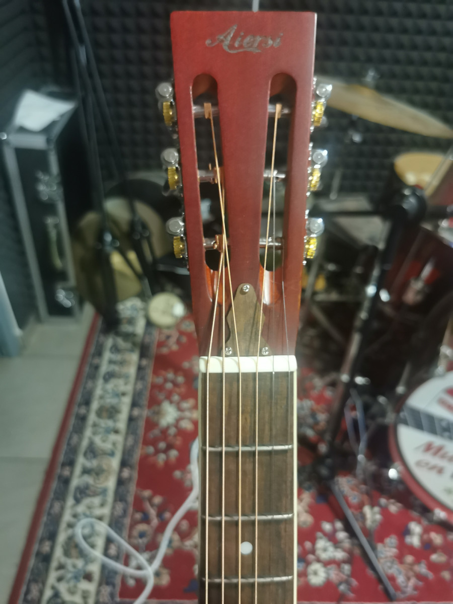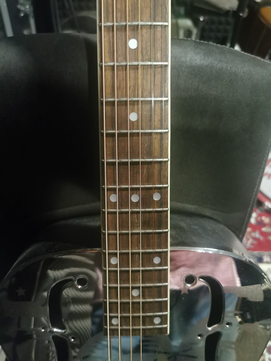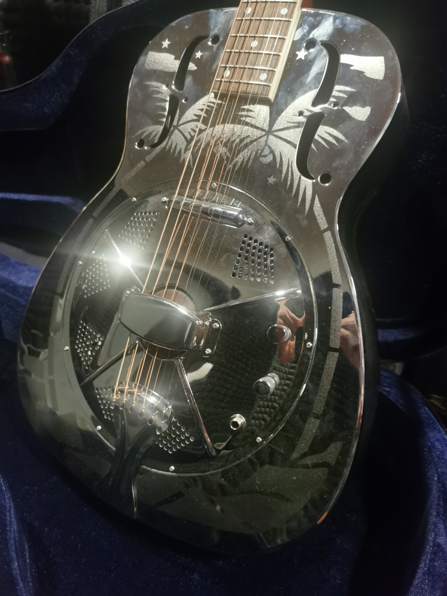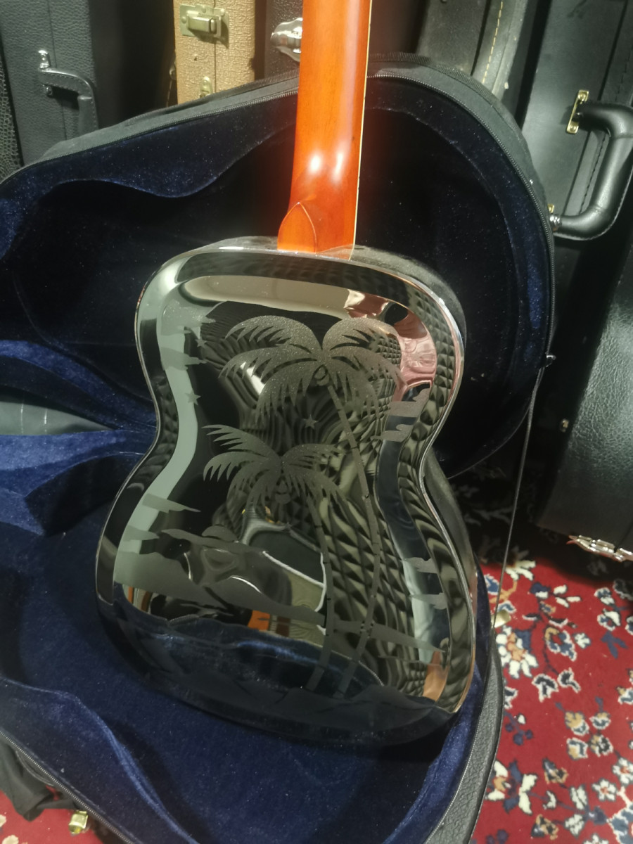 Resonadora dobro aiersi style O Electrificada, lipstick pickup... Buena construcción. Con escena hawaiana y palmeras... Parecida a la National de Mark knopfler, portada de brothers in arms... Es una guitarra preciosa y que suena muy bien. Una buena opción en relación calidad precio. Se puede probar en Girona. Viene con su estuche semirígido, pero que ajusta perfecto. Lo único es que le faltan las lenguetas de la cremallera como se aprecia en una de las fotos. Prefiero trato en mano, pero me puedo acercar a Barcelona. Pero si tengo que enviar, lo hablamos. Gracias
