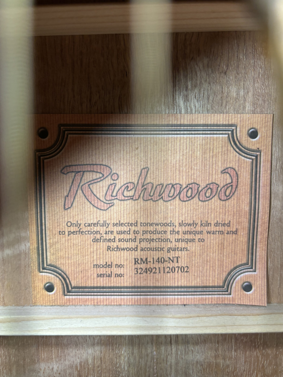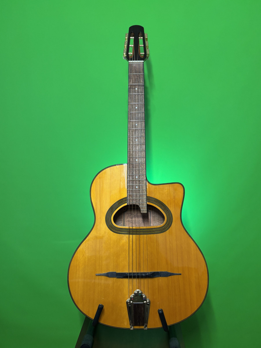 Guitarra acústica estilo Manouche de la marca Richwood. Ideal para amantes de la música jazz y gipsy. Prácticamente nueva, sólo un pequeño toque superficial en el tacón posterior apenas perceptible (ver foto).