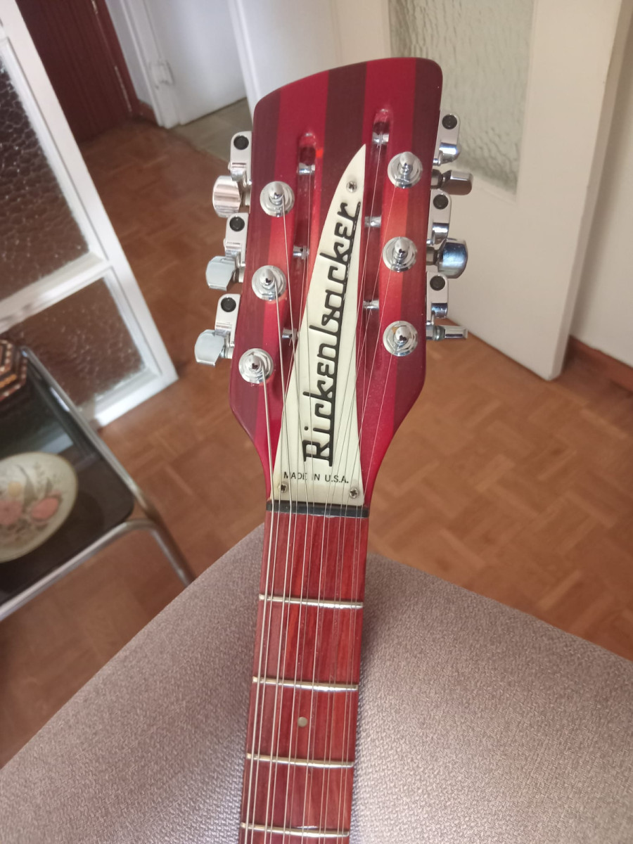 Ricken 330 12 de 1997. La pieza de donde salen las cuerdas suele ser la R típica pero en este caso es la que llevaban las 360/12 V64 (las del binding). No sé si se debe a un cambio o venía de serie. He visto en internet otra a la venta de 1997 con la misma pieza. A veces estas cosas son del tipo que se quedaron un par de meses sin Rs y las fabricaron con el trapecio.