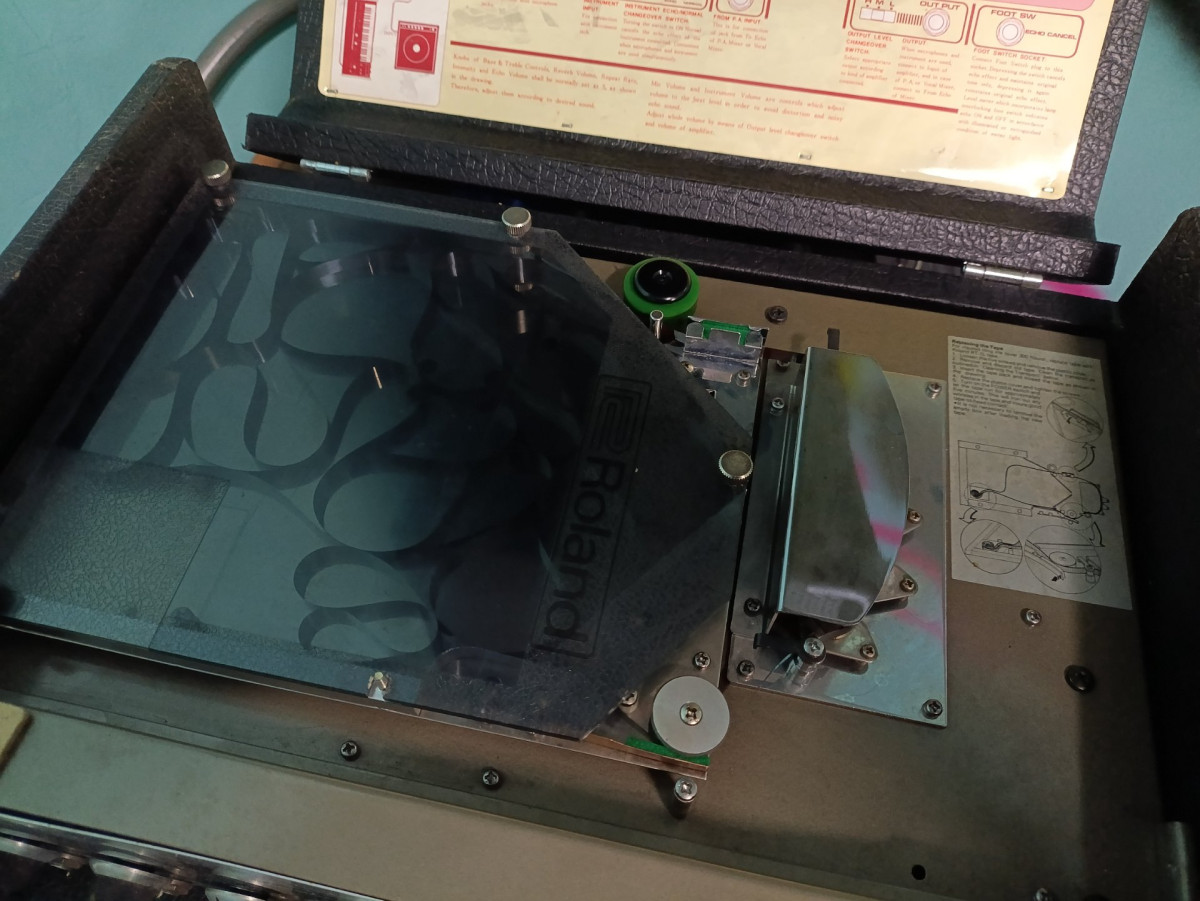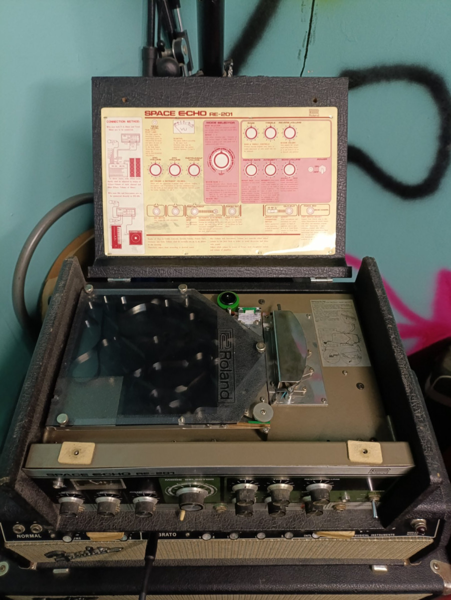 Pues eso. Un mítico Roland Re-201 Space Echo. La unidad está en muy buen estado, tanto estético como de funcionamiento. Algún rascón, o marca del paso del tiempo, pero nada importante. Por el sistema de cierre de la tapa creo que es de primeros que se fabricaron. Tiene mantenimiento hecho hace poco, con cambio de rodillo de goma y felpas de Echofix, y cinta nueva original.