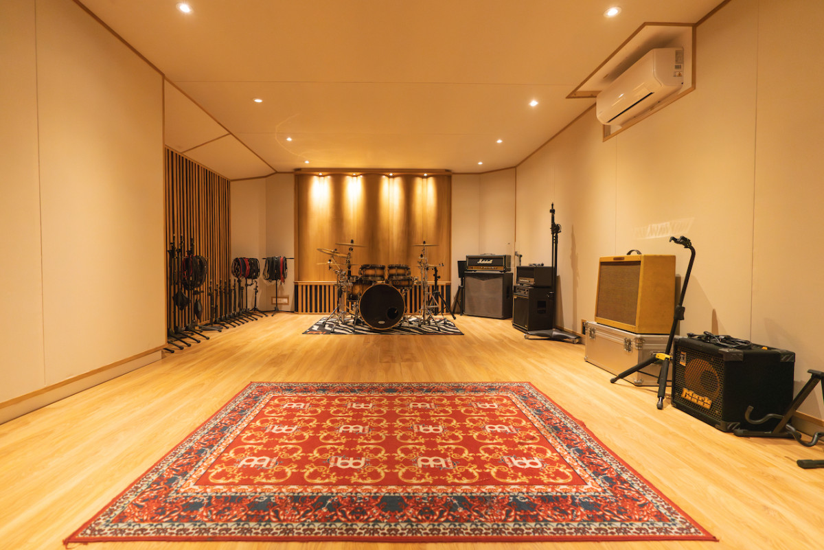 Amplia sala de 38m con aire acondicionado para ensayos en estudio de grabación.