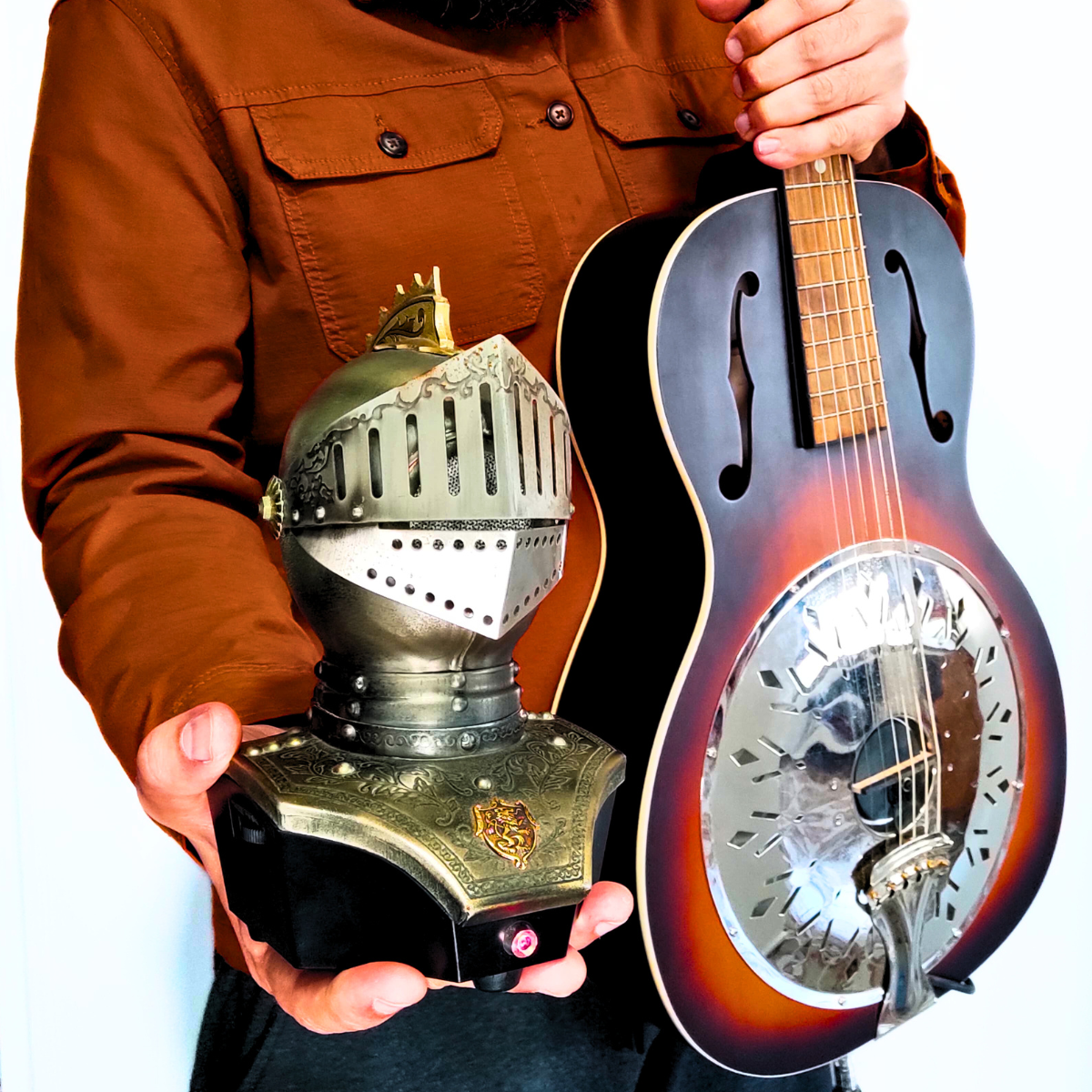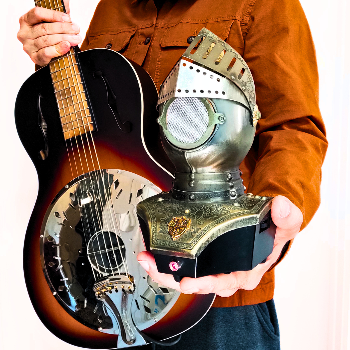 Esta radio japonesa vintage fue uno de los mejores hallazgos! Con este si puedes tocar unos riffs bien épicos! si levantas el visor, verás la cara del gran guerrero que rugirá todo lo que tus dedos hagan! Los controles de volumen y ganancia se encuentran a los lados en la base, así como el input, el "line out" para usar con altavoces más grandes (4 a 8 ohms)