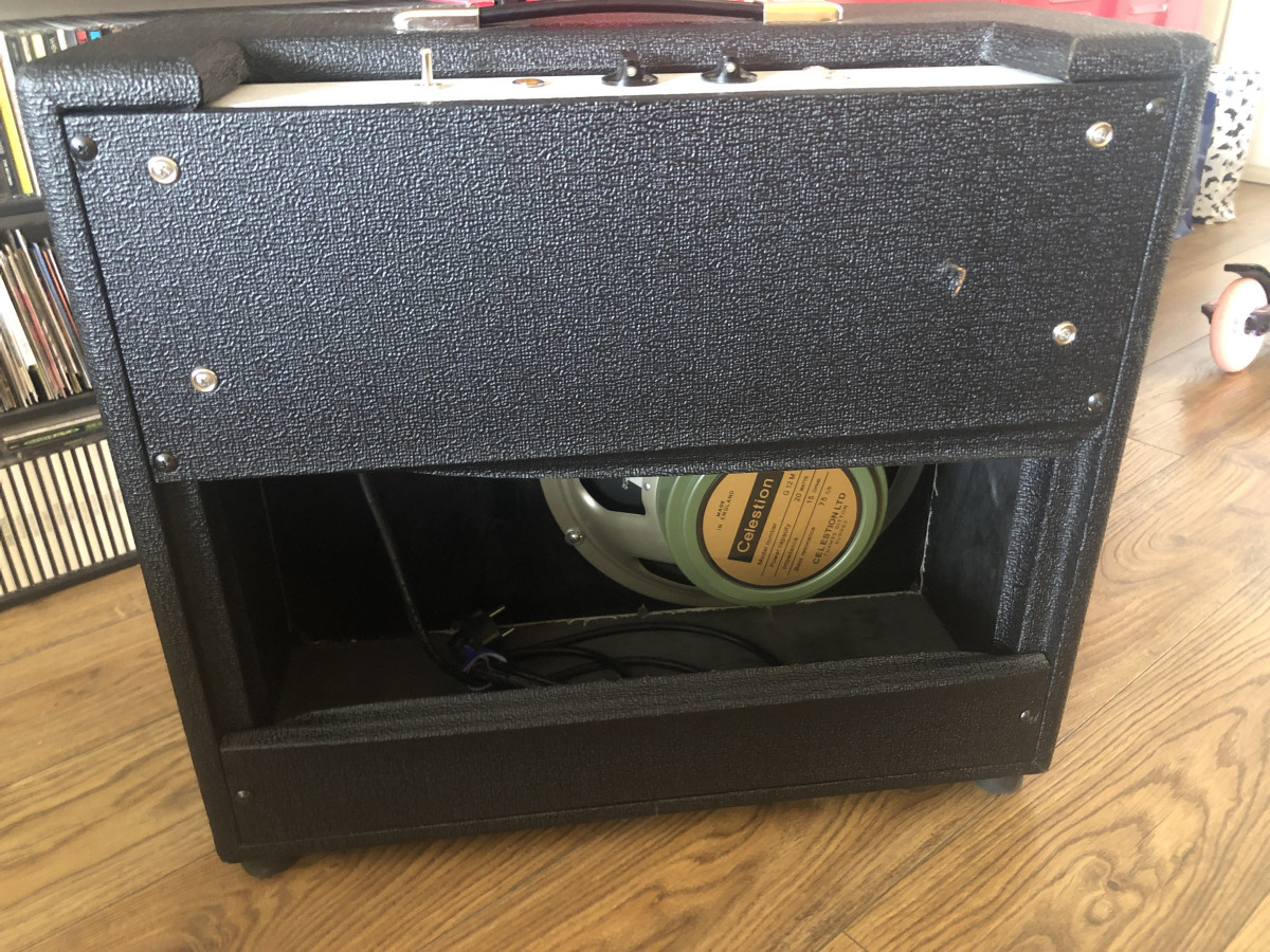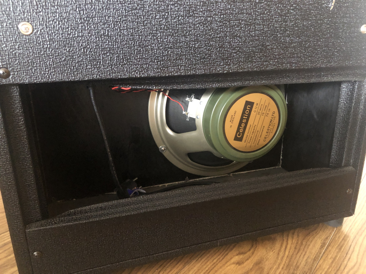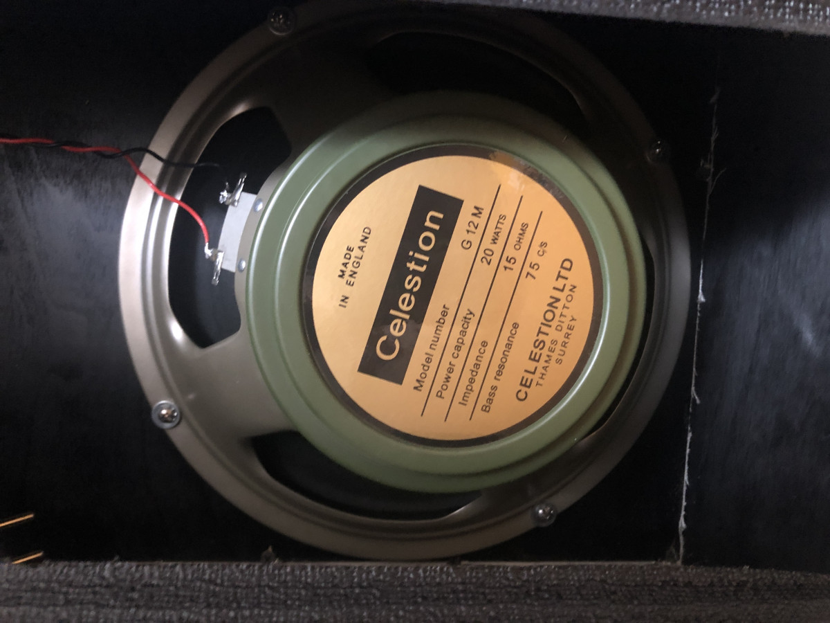 Va con altavoz Celestion G12M Heritage Greenback de 20W (Made in England). 2xEL84 en potencia, 2x12AX7 en previo y una 5Y3 rectificadora.