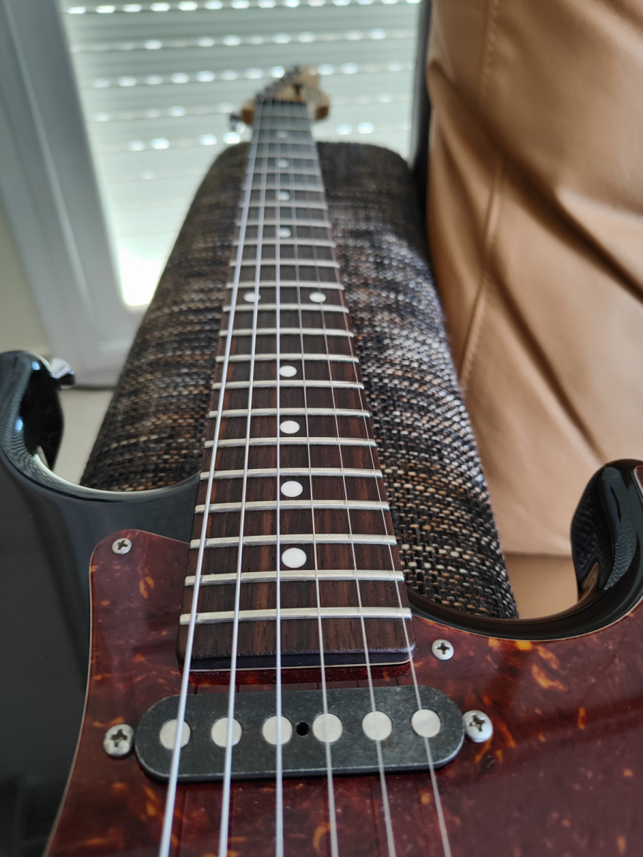 Una gran stratocaster, super cómoda de tocar, prácticamente nueva, sin golpes ni ralladas, clavijeros de bloqueo, uno de los mejores puentes que he visto en una strato y todo el material muy top!
