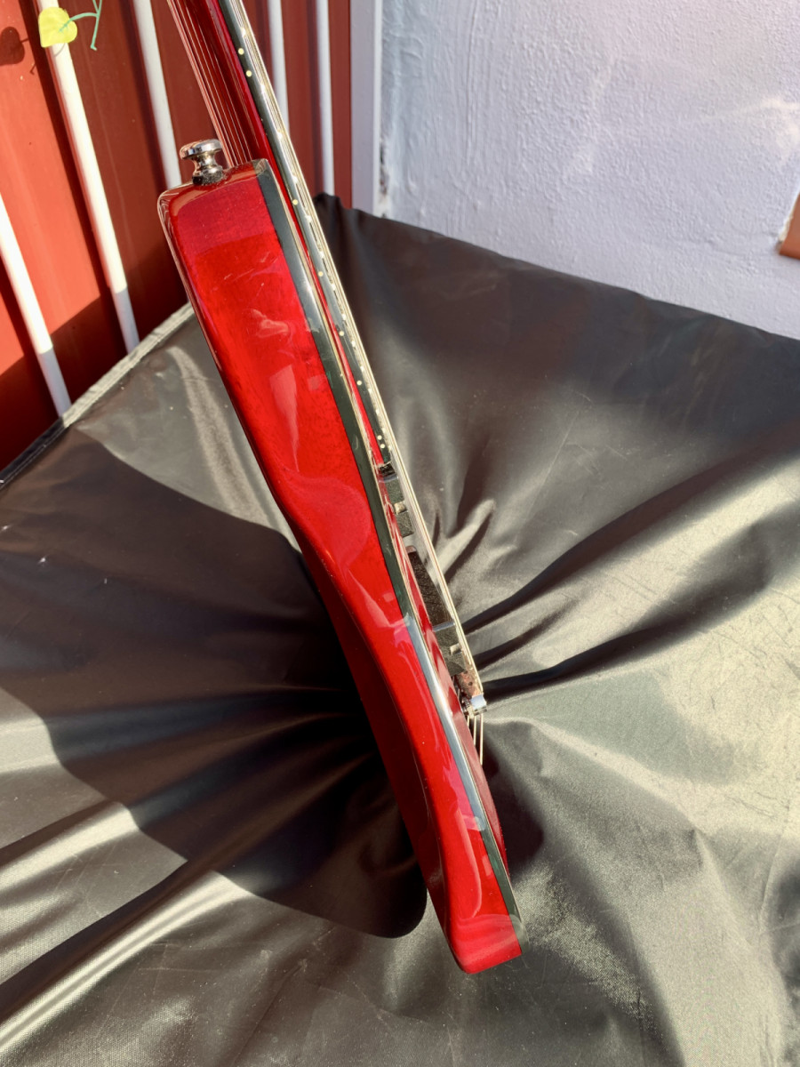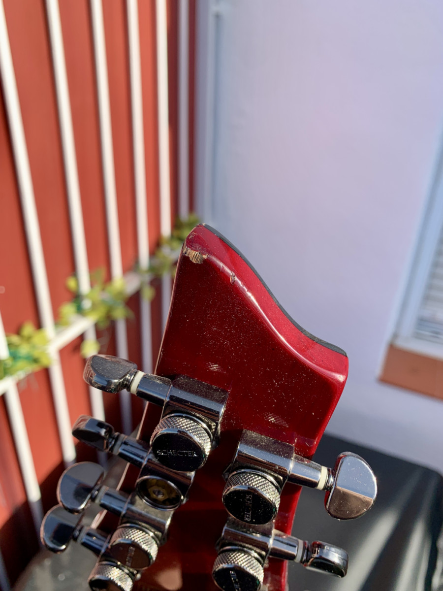 Falta uno de los mecanismos de bloqueo del clavijero y tiene un pequeño desprendimiento en el clavijero. Por lo demás, la guitarra está en buen estado, con algunos pequeños arañazos en el cuerpo.