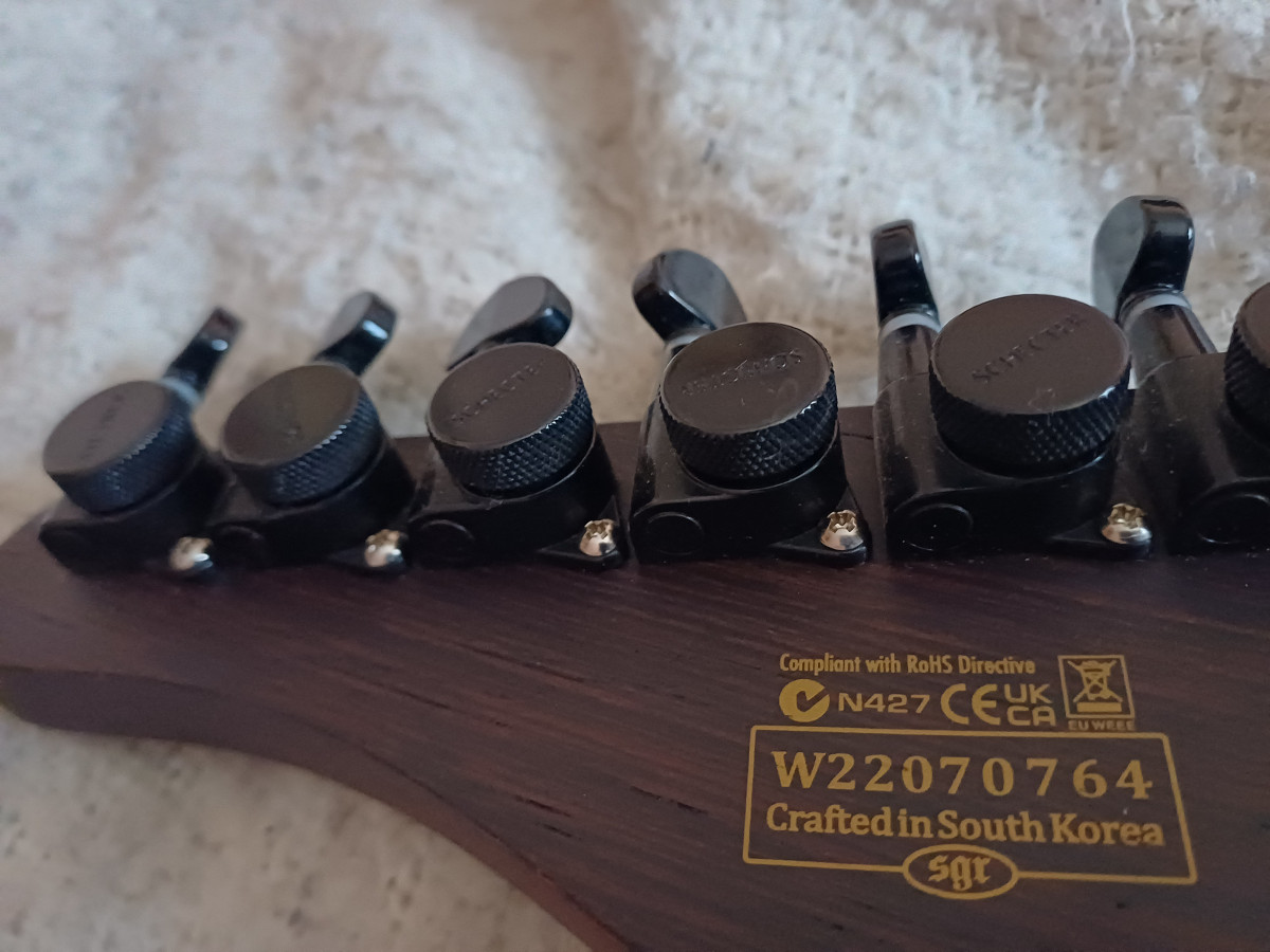 Guitarra modificada, se cambi el selector de 5 posiciones a otro de 3, con un control de volumen para cada pastilla (elimine el de tono) y se sustituyeron las pastillas originales por LACE FINGER BURNERS.