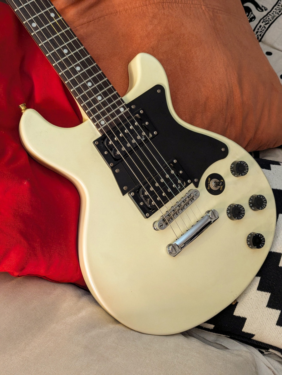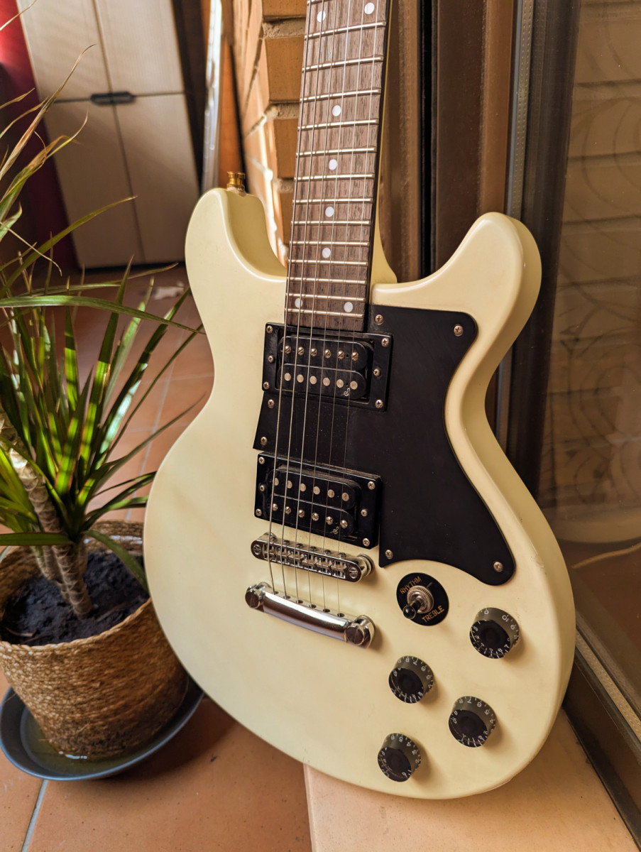 Está guitarra es una todoterreno, ligera y con muy buen sonido, tipo LPJ o SG, cuerpo y mástil de caoba y diapasón de palo rosa.