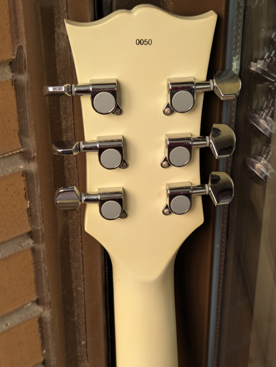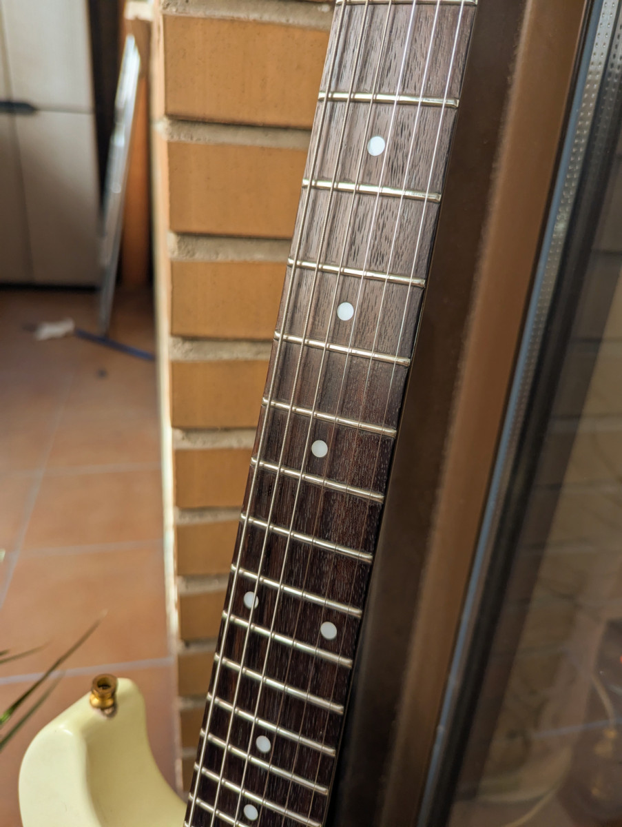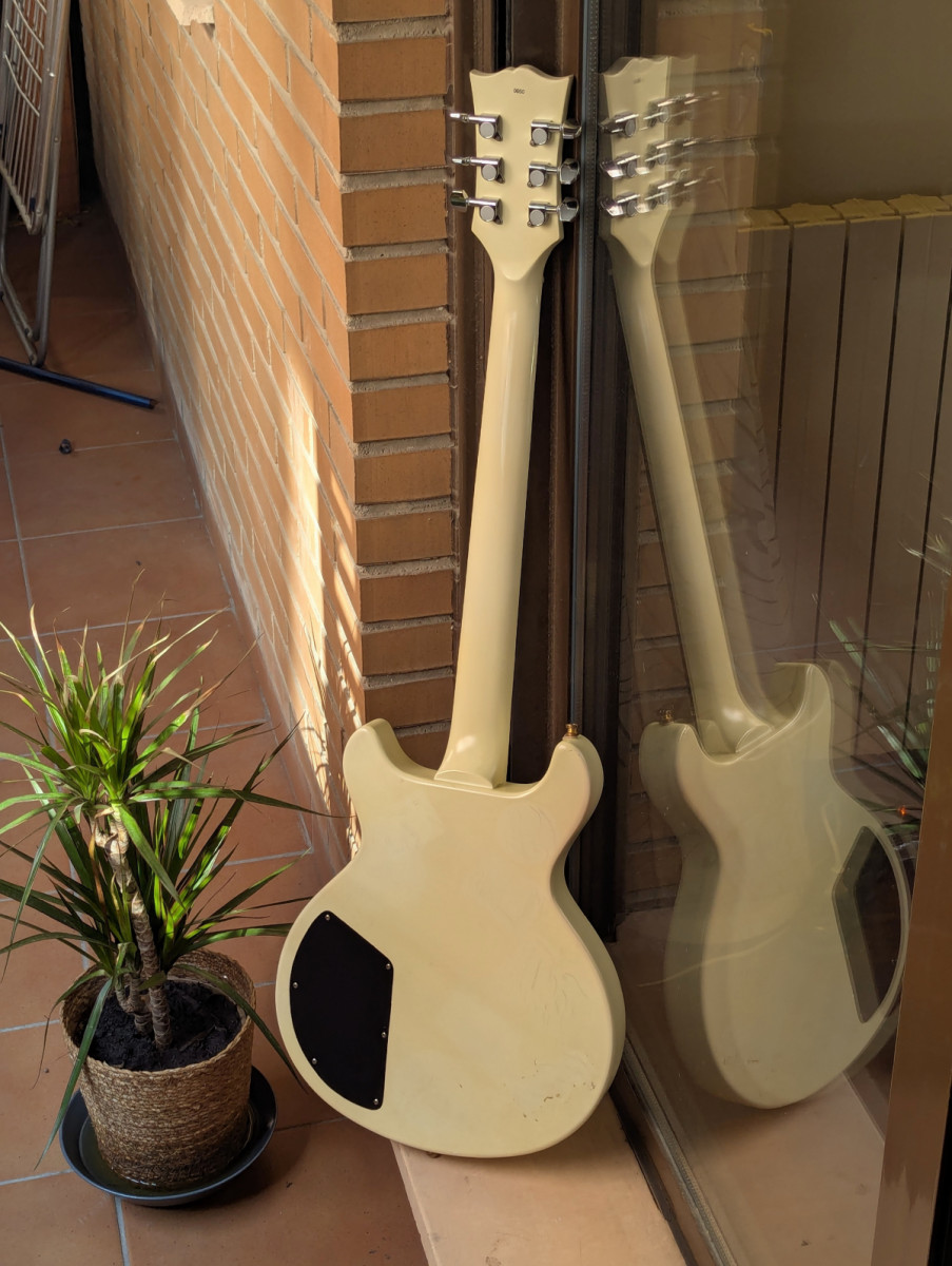 Tiene sus marcas de uso y de alguna ex-pegatina pero se toca de maravilla y tiene muy buena resonancia, alguno que la ha visto, probado y escuchado ya me la ha querido comprar pero nunca he querido quitármela por ser mi comodín, pero ahora le toca partir...
