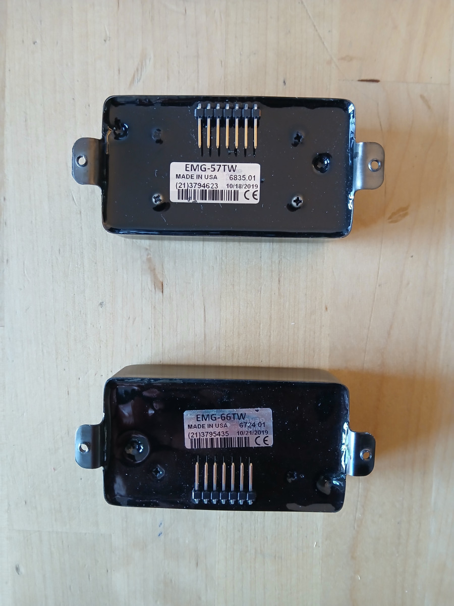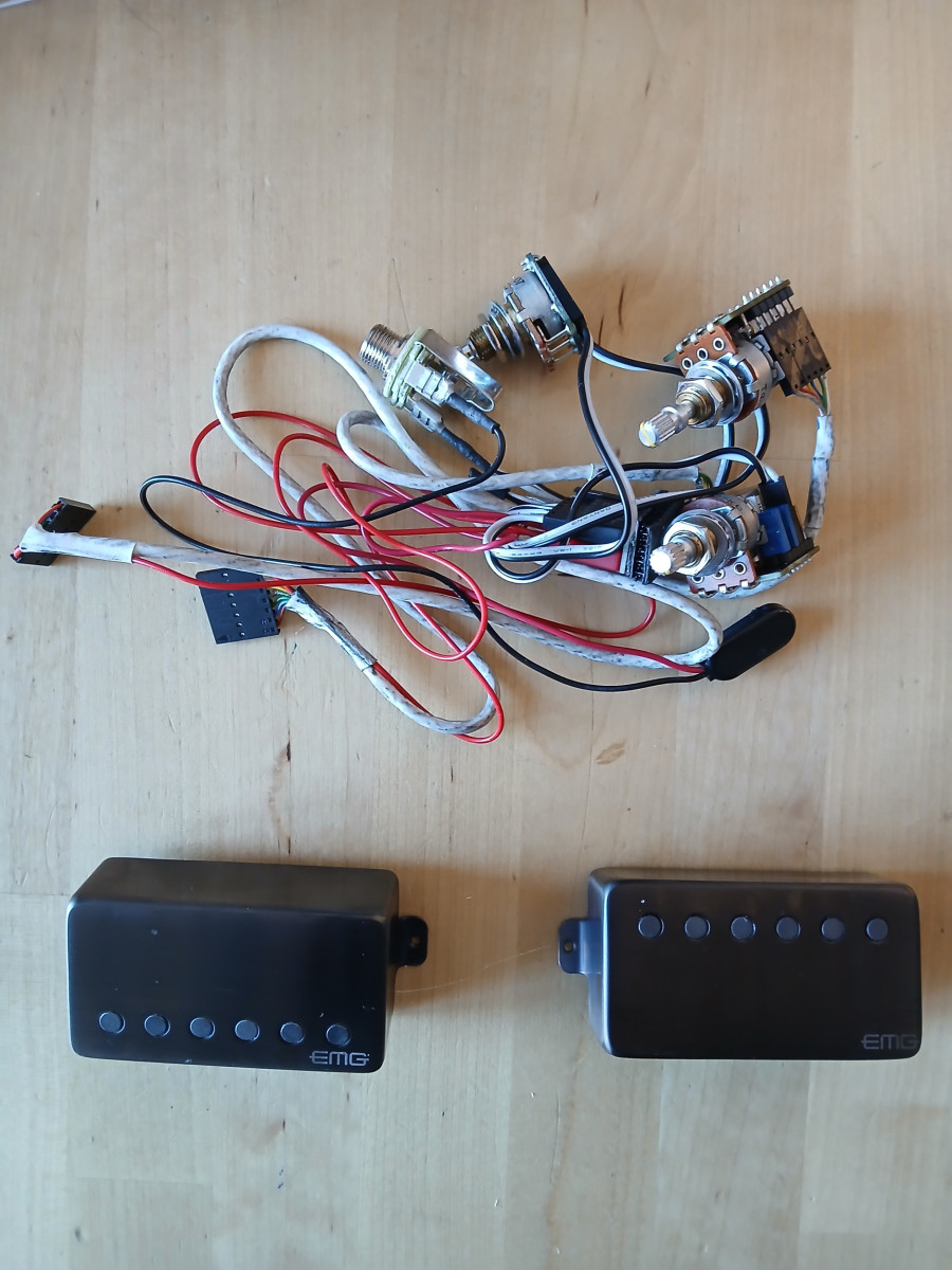 Vendo este set de pastillas. Incluyo dos potenciómetros de volumen y uno de tono es sistema de conexión rápida y la conexión a la batería. Los potenciómetros de volumen son push pull. Incluyo 3 de los tornillos y muelles para fijar las pastillas, falta uno.