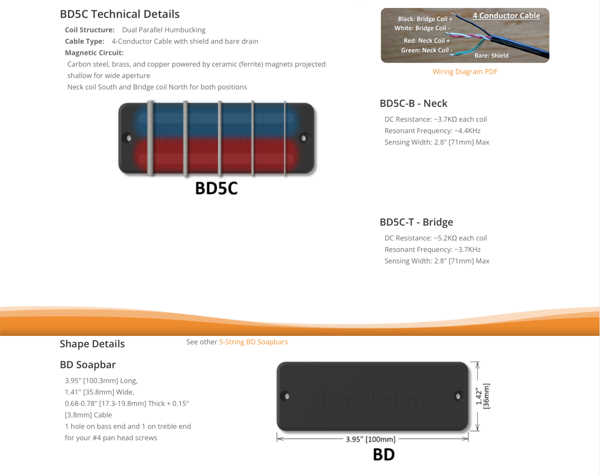 Como se ve en la imagen de soporte de las pastillas Bartolini BD5C, la pastilla es tipo rail humbucker en su interior, de manera que de punta a punta de la banda, se produce la captación del sonido de las cuerdas, y al ser doble, tiene cancelación de ruido. Ésto es importante porque se adapta a diferentes espaciados de cuerdas en el puente del bajo, incluso podría usarse en bajos de 4 ó 6 cuerdas, según la separación entre las cuerdas.