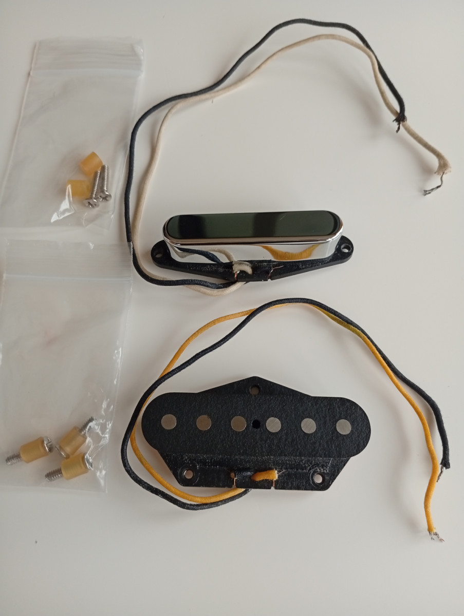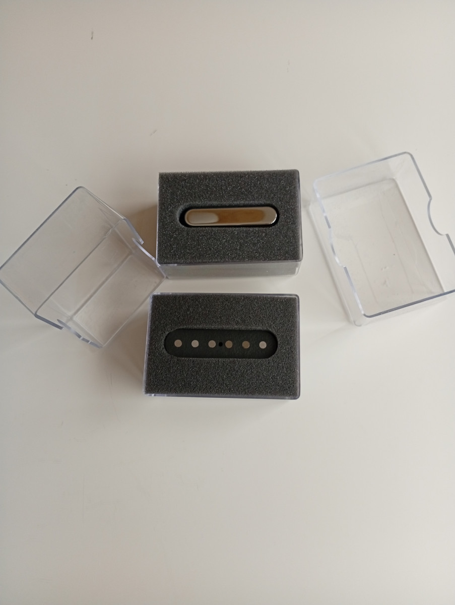 Imanes alnico V, medidos 5,88 k la del mástil y 7,78 k la del puente; con toda la longitud de los cables. Sonido clásico y articulado, con el twang que se espera en unas pastillas para telecaster. Las cajas no son originales.