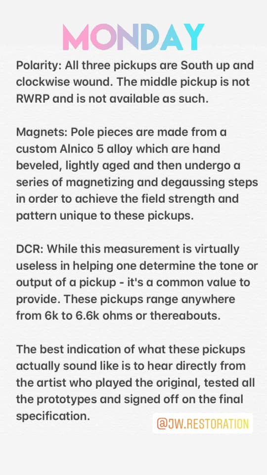 Formvar 42 ag. Bobinado manual, guiado y tensado en una bobinadora Stevens de la década de 1950. Polaridad sur. Imanes de Alnico V, biselados a mano, ligeramente envejecidos, magnetizados y desmagnetizados para lograr una intensidad de campo única.
