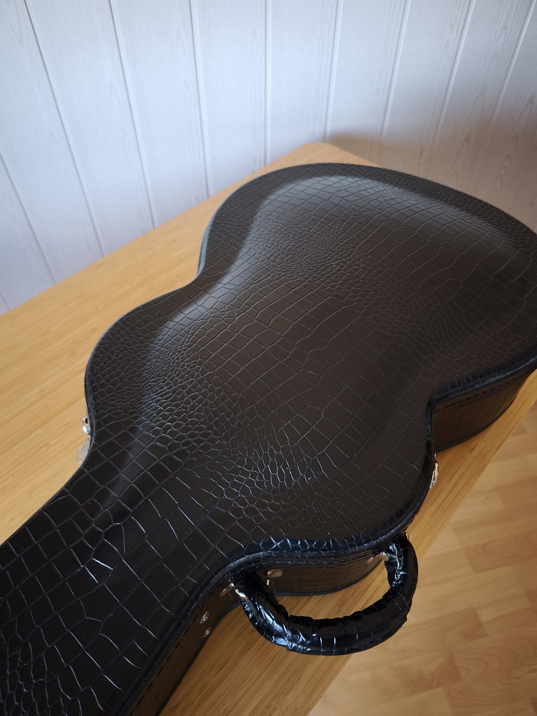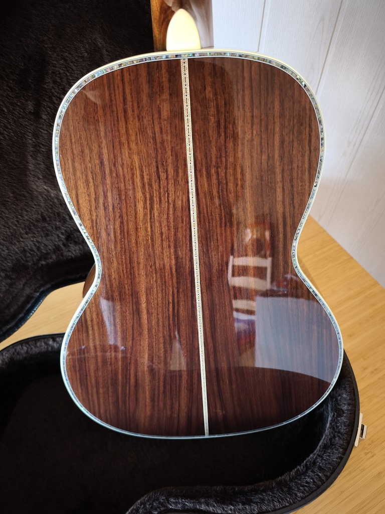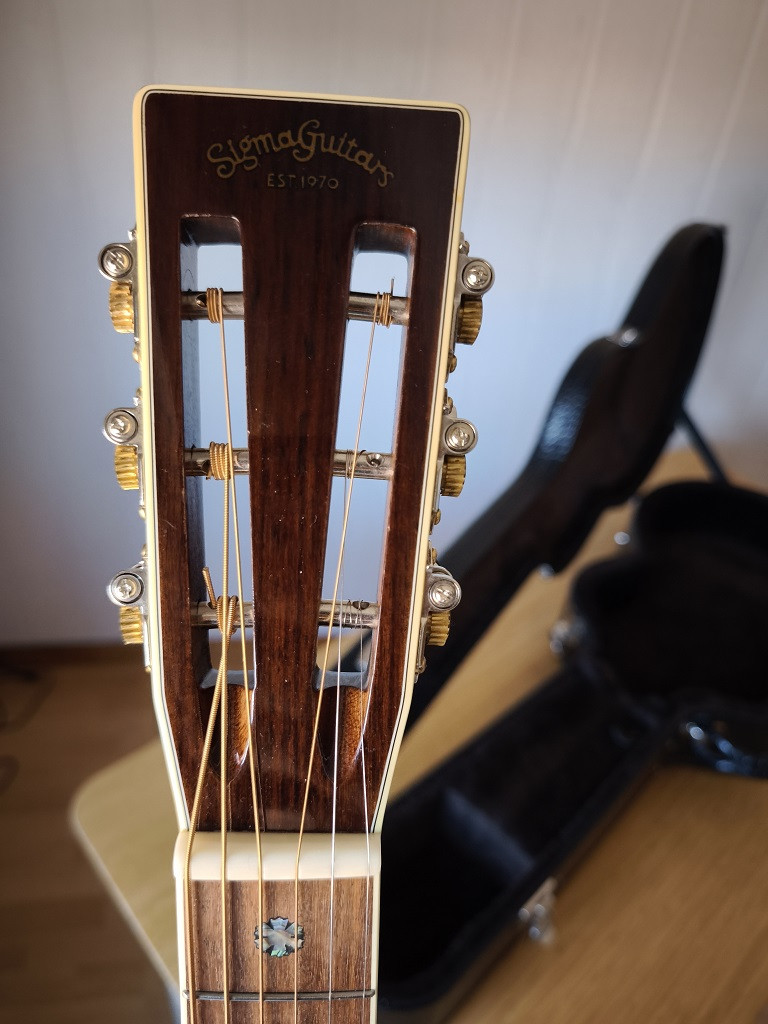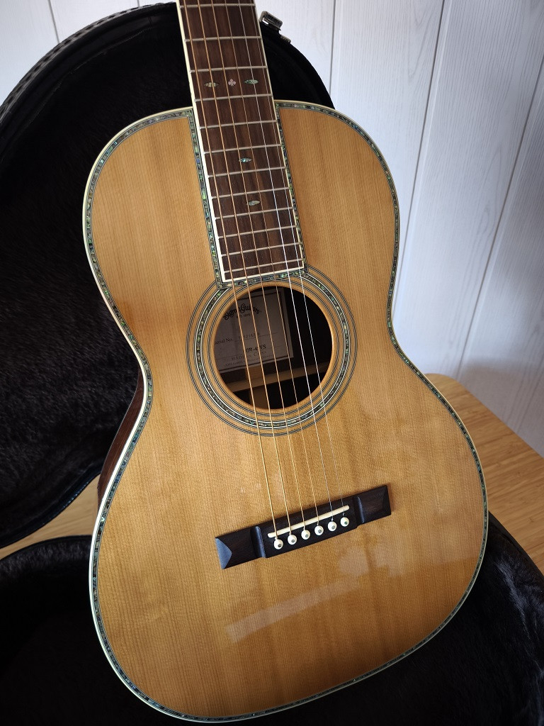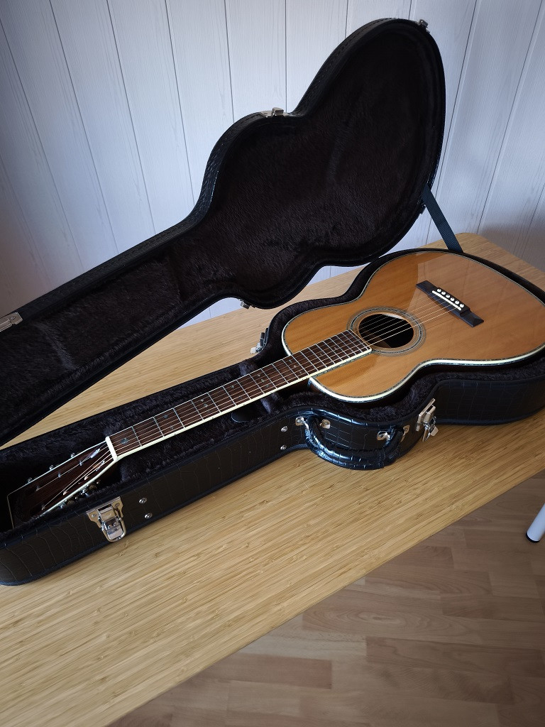 Es una guitarra blusera, de tamaño muy agradable y con ese sonido característico de éste tipo de caja. Está en condiciones inmejorables, no tiene el más mínimo rasguño. El perfil del mástil es en V suave con cejuela de hueso y un ancho de 44,5mmy selleta también de hueso. El abeto Sitka de la tapa ha cogido un color tostado bastante agradable en mi opinión..