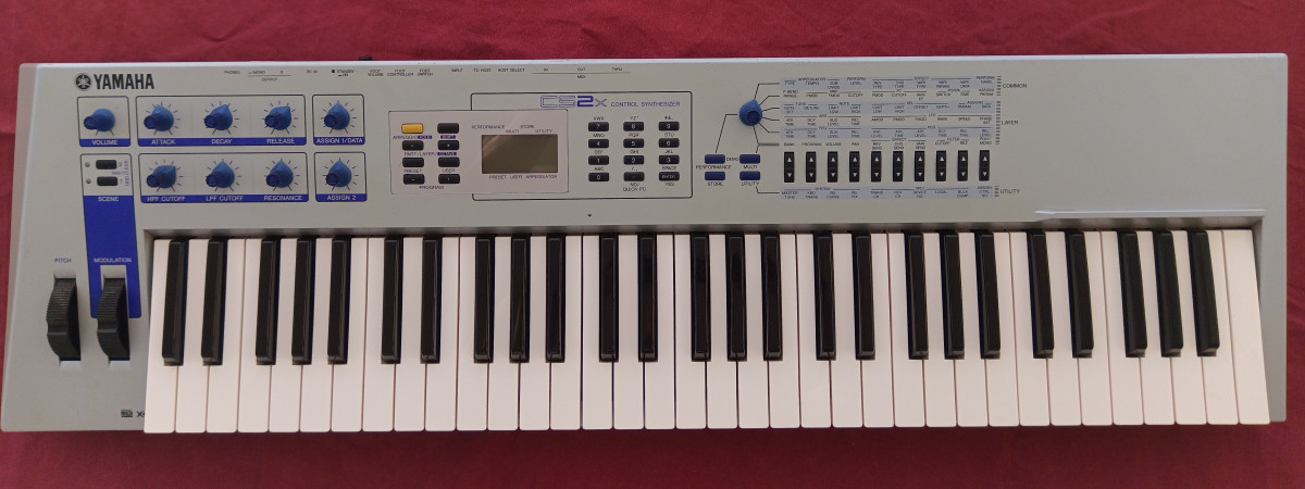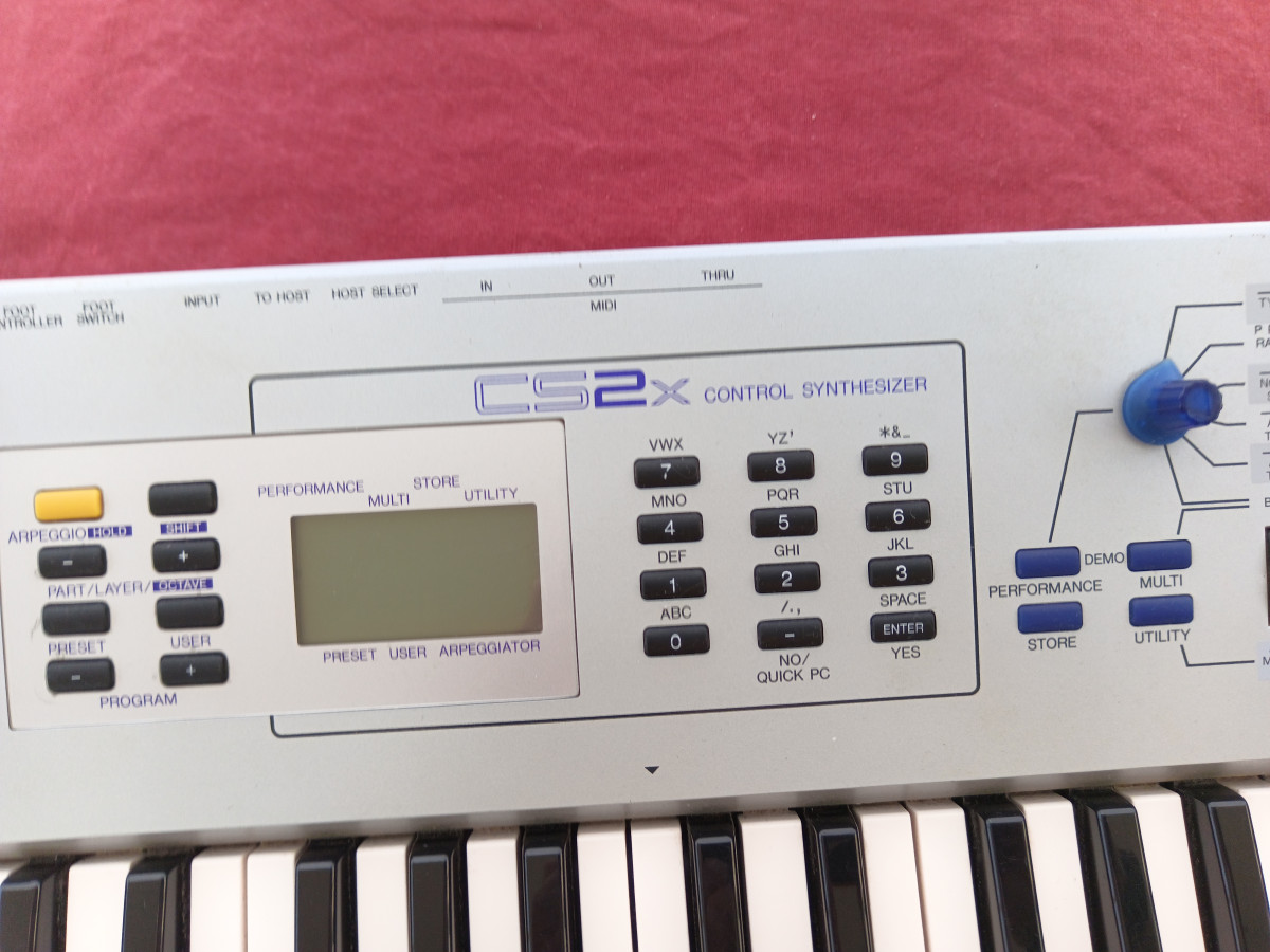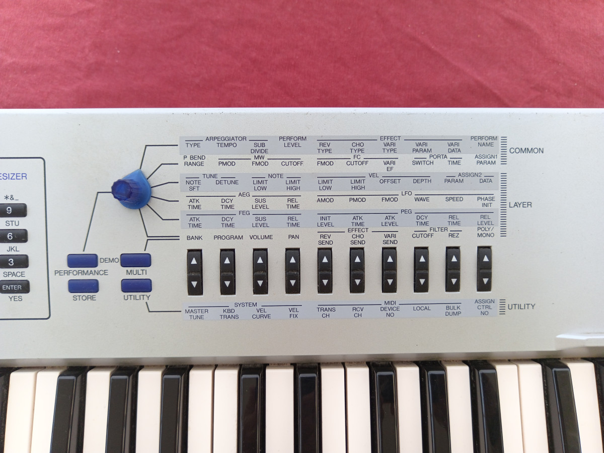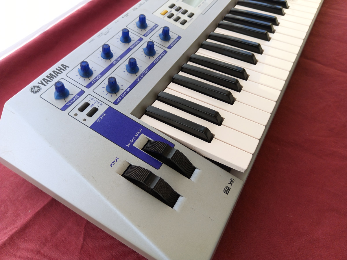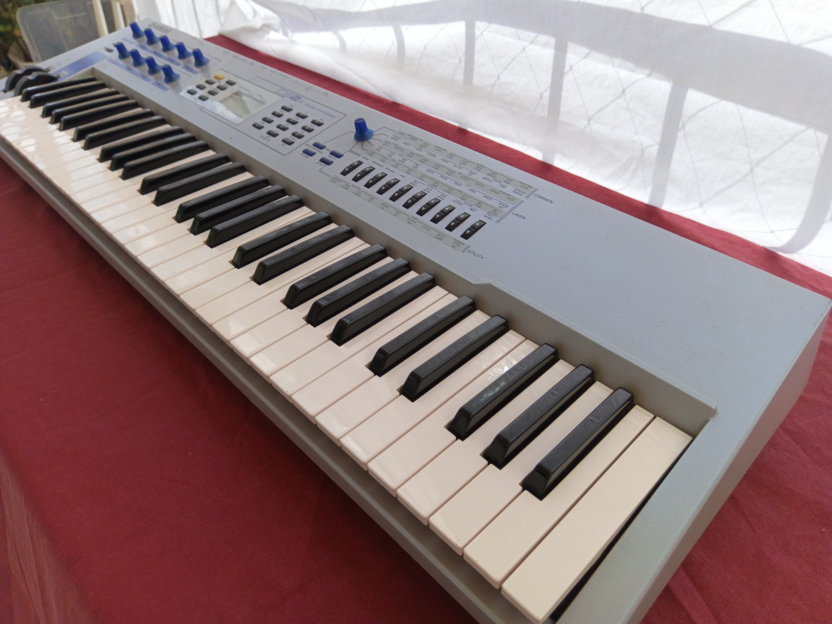 - 61 teclas, sensibles a la velocidad, polifonía de 64. Salidas estéreo y MIDI.