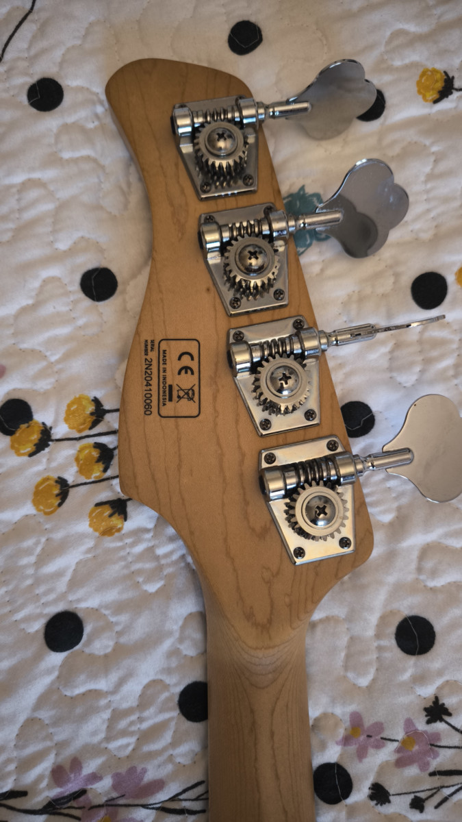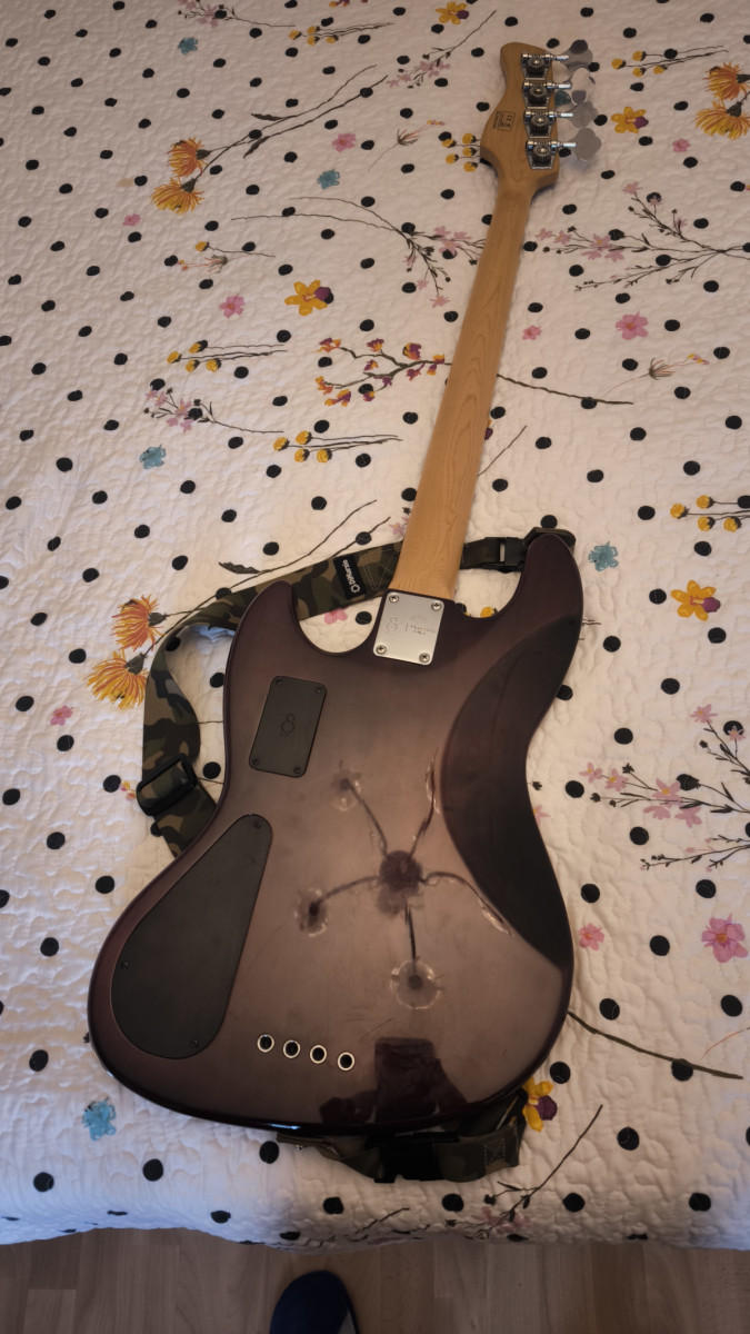 Cuerpo tipo jazz bass de aliso americano con tapa y ribete en arce acolchado. Mástil tipo C con diapasón en ébano y radio de 9,5 “. Escala de 34”. 20 trastes médium. Puente MM Heavy Mass. Pastillas Super J Revolution y previo H3.