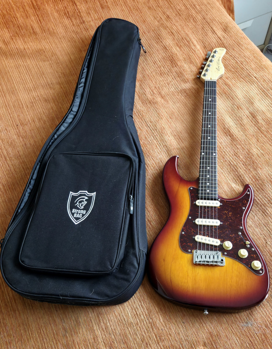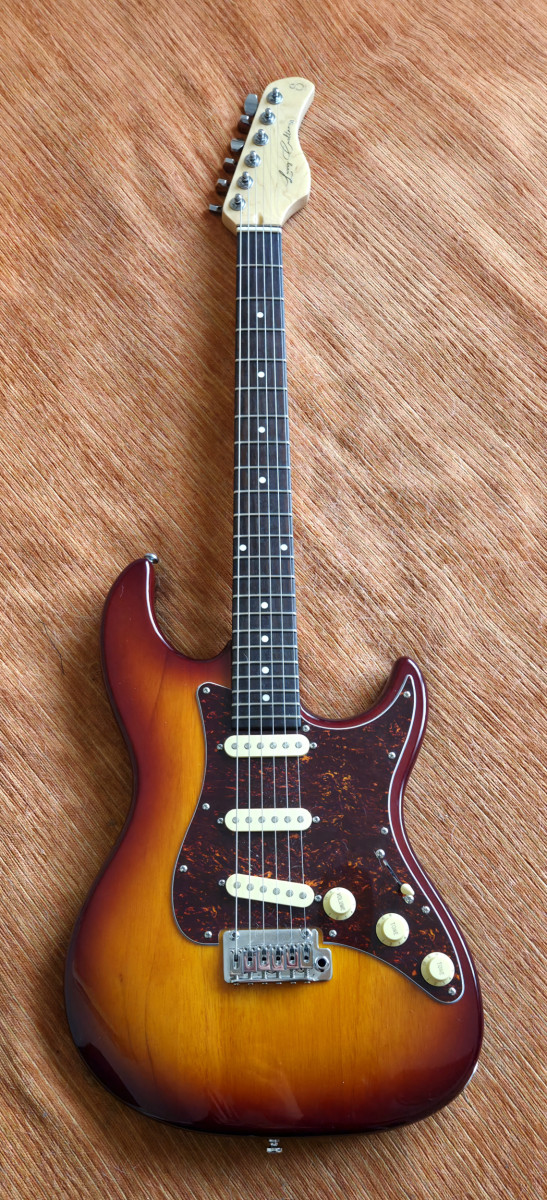 Guitarra eléctrica Sire S3 con acabado Sunburst y configuración de pastillas SSS, diseñada por Larry Carlton. Incluye funda.
