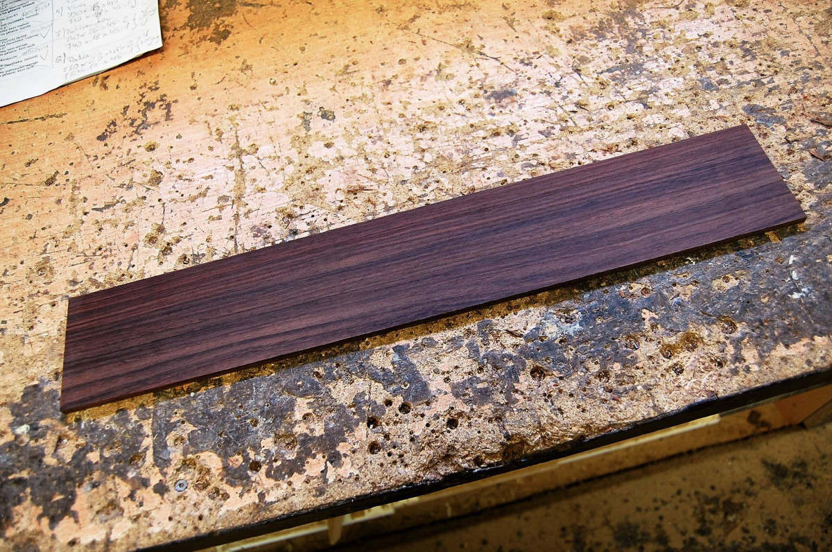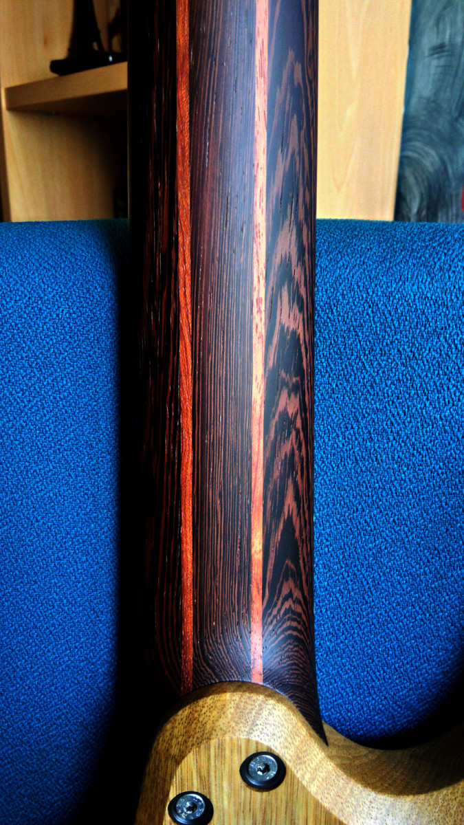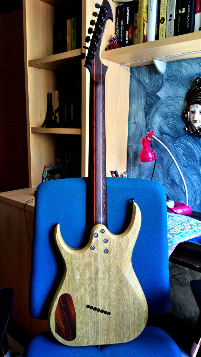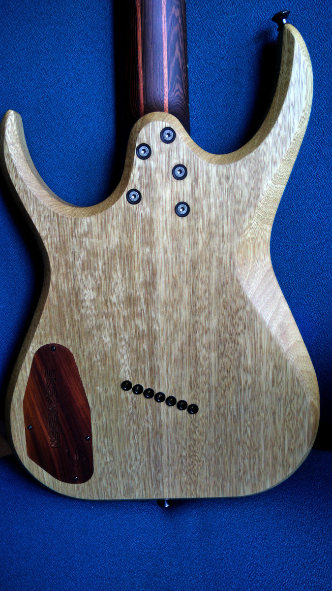 La guitarra es de cuerpo de limba blanca (white limba/korina), con tapa de raiz de álamo (poplar burl), mastil atornillado de 5 piezas de wenge y bubinga y diapasón de palorrosa púrpura (es de un lote super pequeño de maderas de palorrosa con un color mas violaceo de lo habitual, que recibieron los de Skervesen y que nunca han vuelto a conseguir), lleva puente Hipshot, clavijero de bloqueo Schaller, pastillas Bare Knuckle Black Hawk (cerámica en puente, alnico en mastil), selector de 3 posiciones de pastillas, 1 volumen y selector de 3 posiciones para combinación de bobinas, lo que en Skervesen llaman WDM, marcadores luminlay en laterales y frontal, 24 trastes de acero inoxidable. Además como caracteristica especial, en la pala modelo Viper, lleva una lámina de refuerzo de aluminio, para dar mayor estabilidad, y que es algo que en general solo hacen en el modelo Viper. La multiescala es 25.5 a 27".