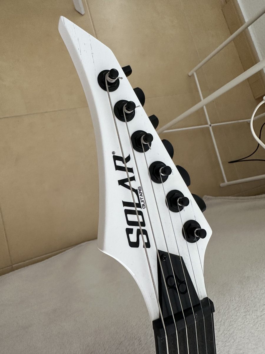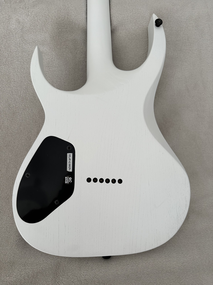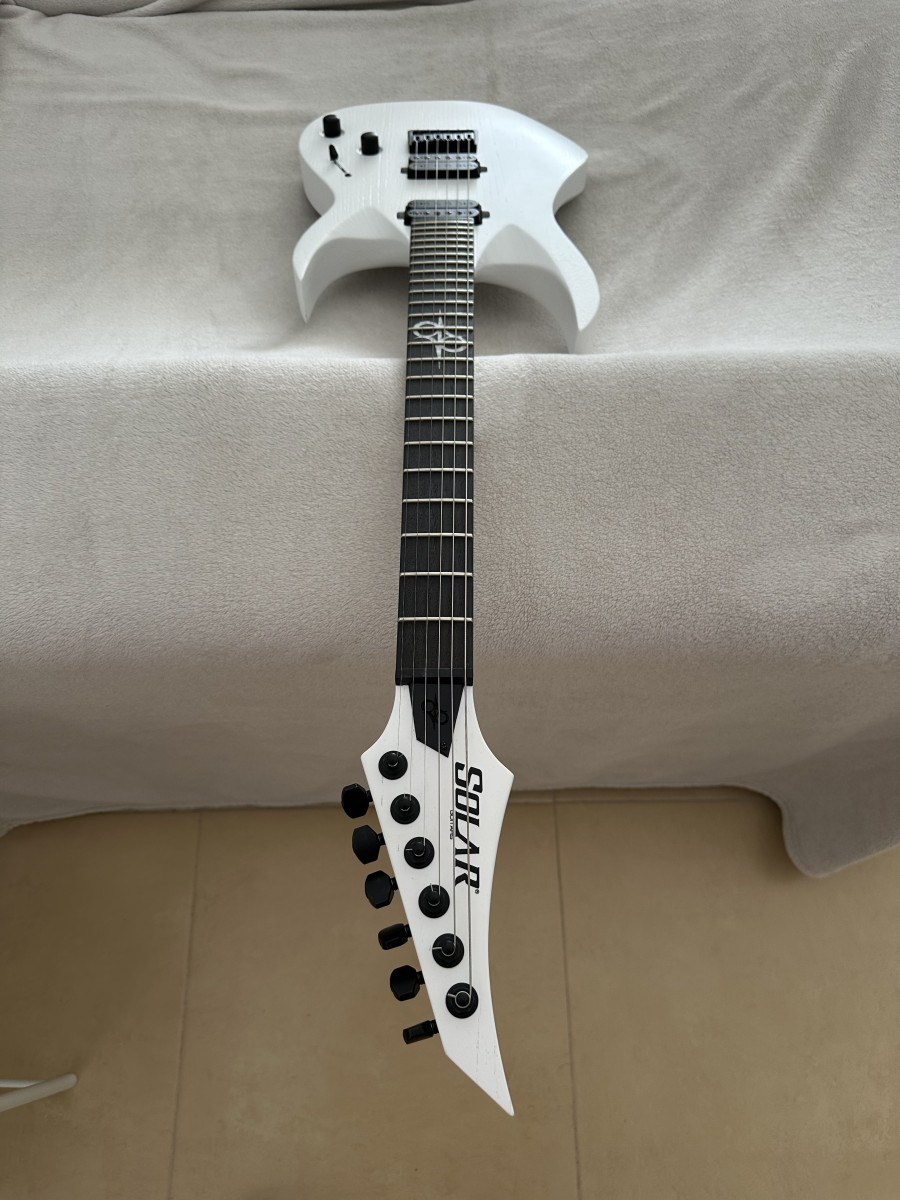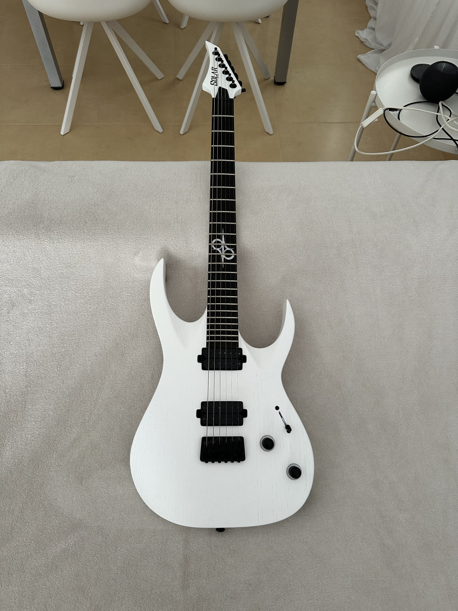Solar A2.6 blanca con el poro abierto. Se ve la veta de la madera en el cuerpo y en la pala. Pastillas Duncan Solar +, mejores que las estándar. Diapasón de ébano. Está a estrenar y recién ajustada y repasada de trastes. La vendo porque simplemente no es mi guitarra. Cualquier duda consultar.