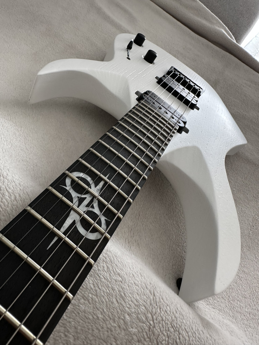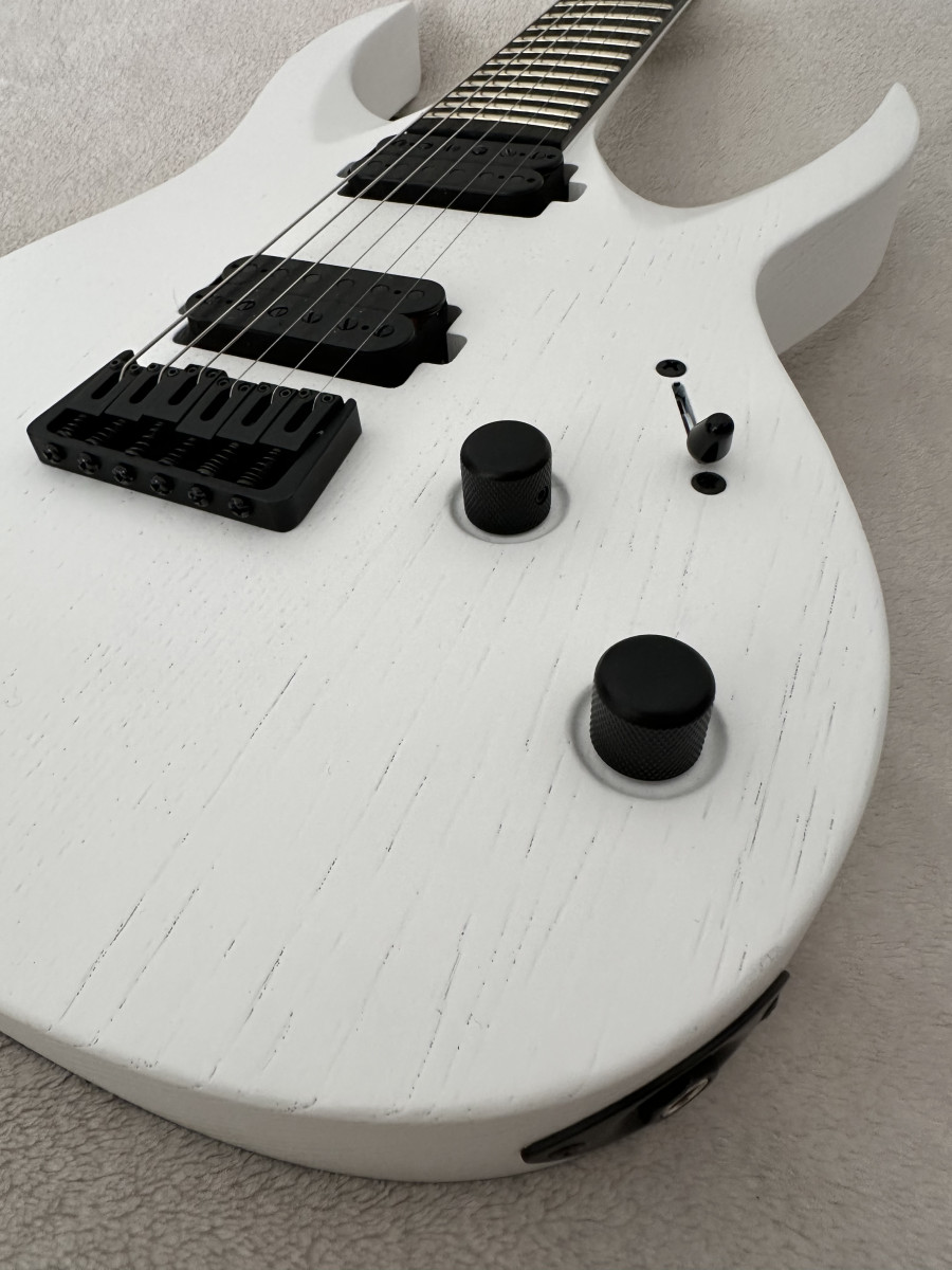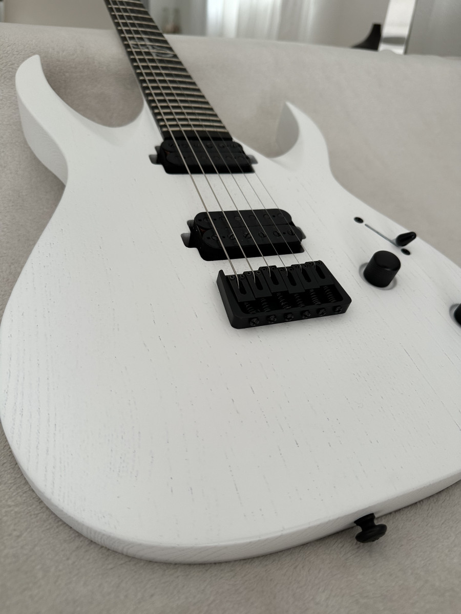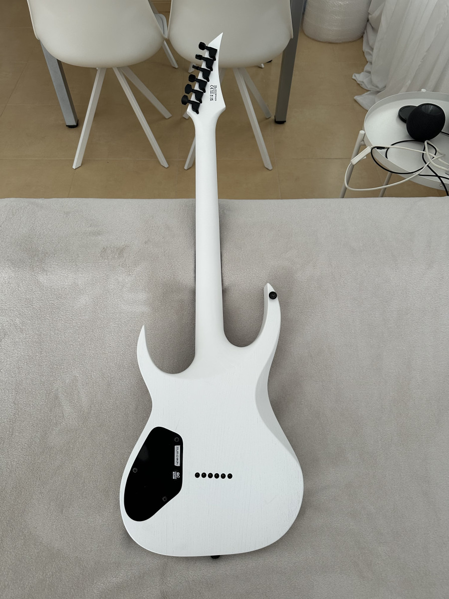 Solar A2.6 blanca con el poro abierto. Se ve la veta de la madera en el cuerpo y en la pala. Pastillas Duncan Solar +, mejores que las estándar. Diapasón de ébano. Está a estrenar y recién ajustada y repasada de trastes. La vendo porque simplemente no es mi guitarra. Cualquier duda consultar.