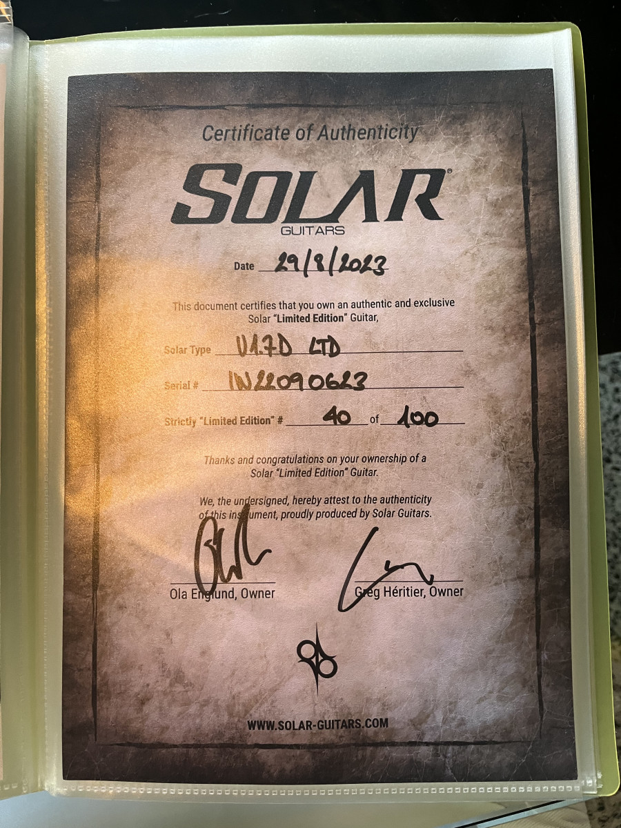 Guitarra eléctrica Solar de 7 cuerdas, en perfecto estado. Es una guitarra impresionante, con un diseño elegante y un acabado impecable. La vendo por falta de uso.