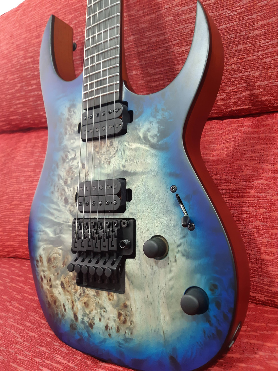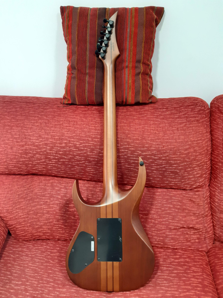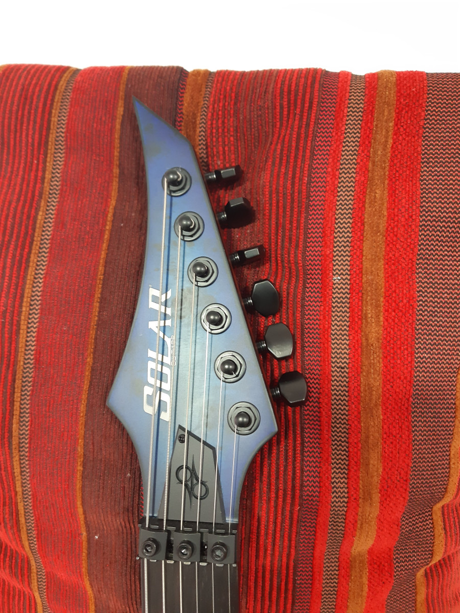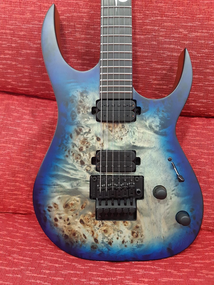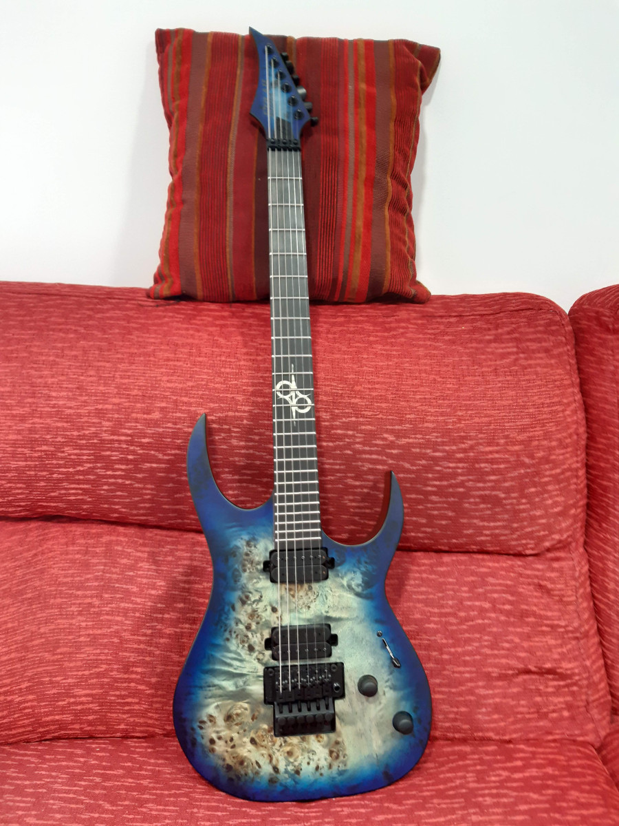 Cuerpo de caoba, trastes de acero inoxidable, puente Floyd Rose 1000, pastillas Duncan solar.