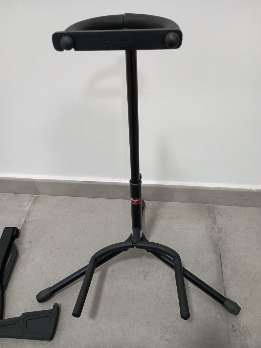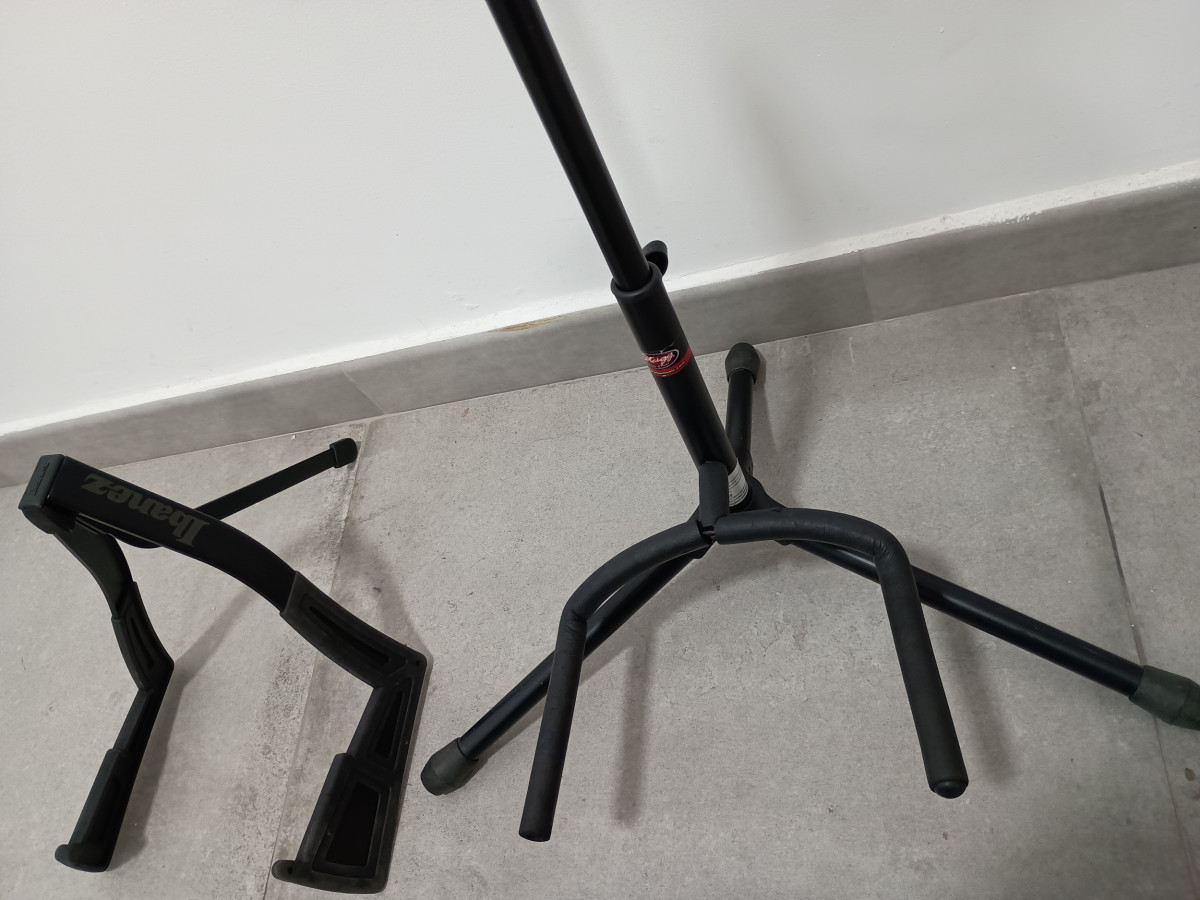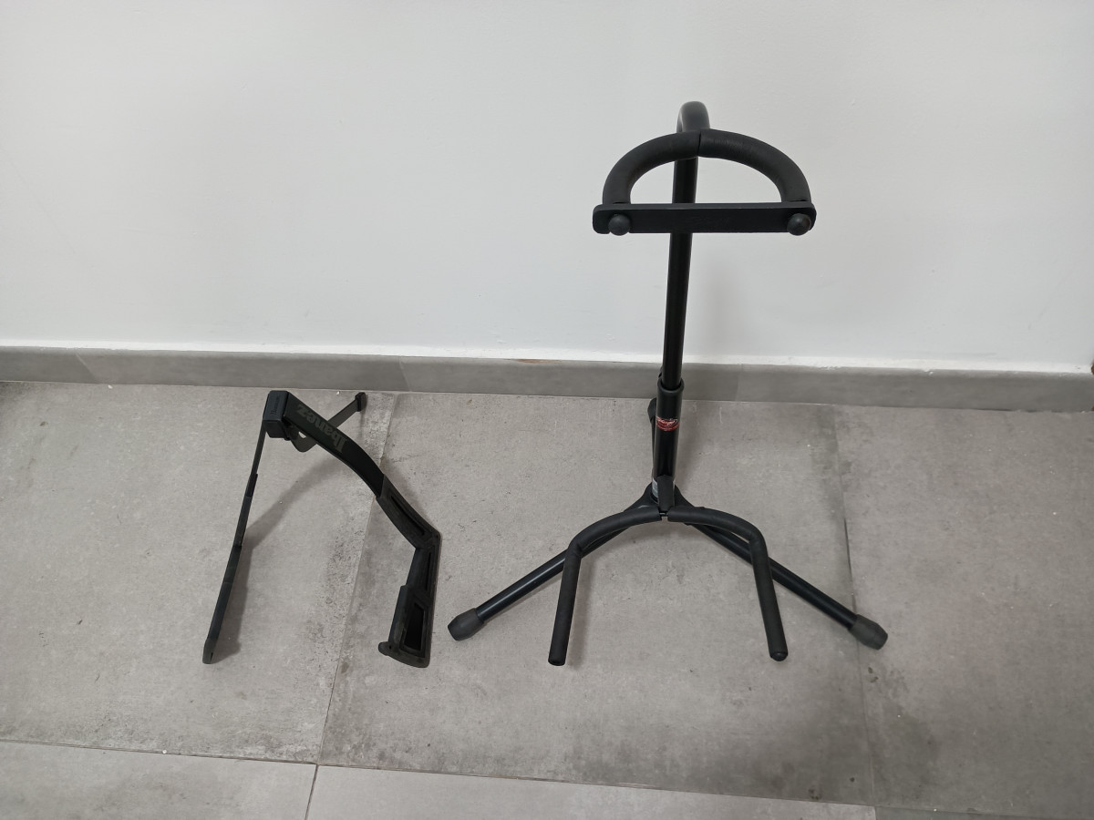 Set de dos soportes para guitarra o bajo. Uno de ellos es plegable para facilitar su transporte.