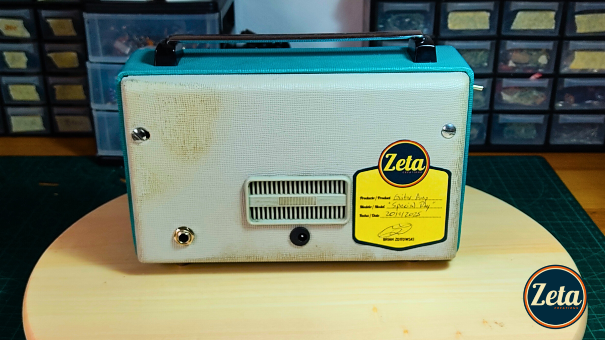 Mira nomás esta hermosa radio vintage turquesa convertida en un ampli portátil para guitarra que se suena todo! si te gustan el sonido vintage cuasi Lofi, aquí lo tienes! Con controles de volumen y ganancia!