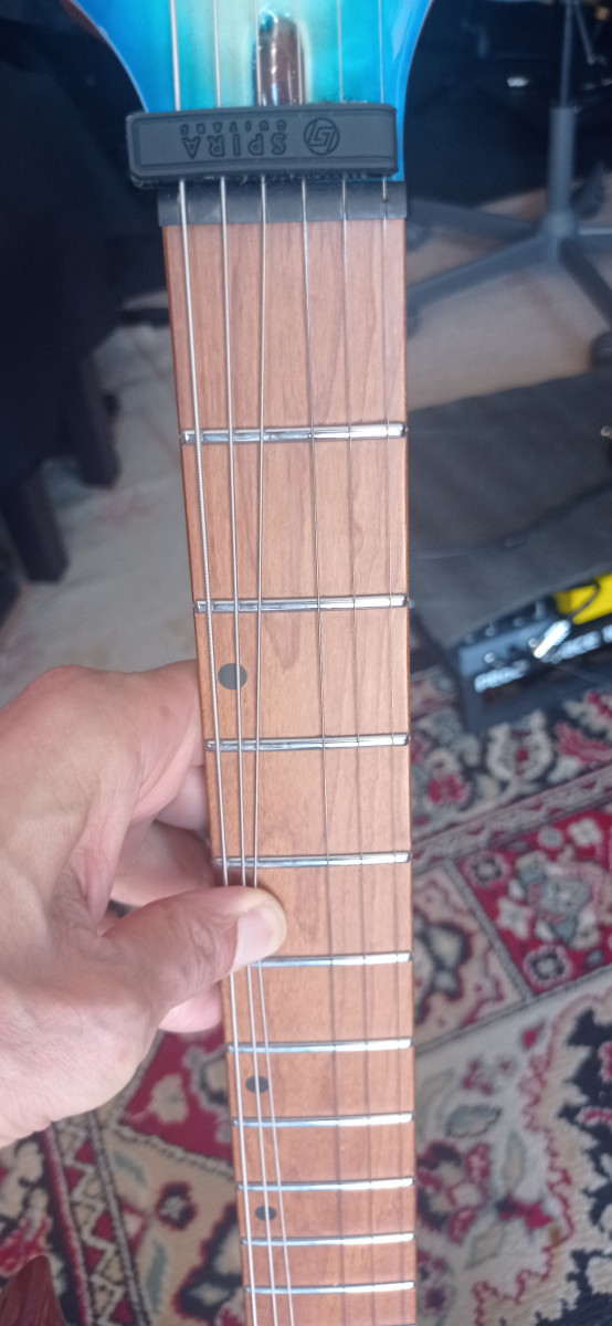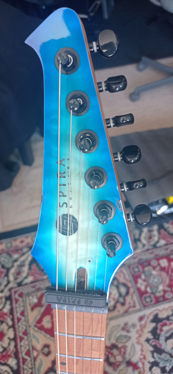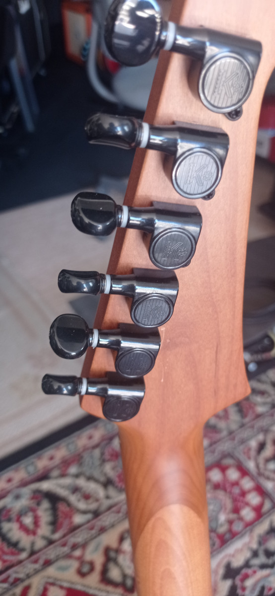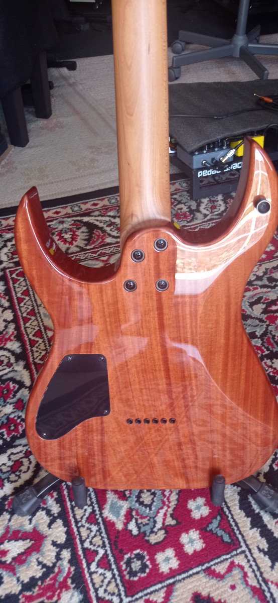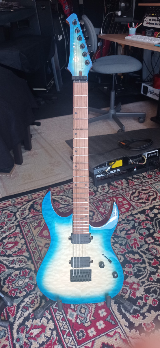 Guitarra muy apañadita para su precio. Tiene algunos dings en la pala, el clavijero fué sustituido por un Wilkinson de calidad. Caoba, arce tostado y pastillas high output. Guitarra para metal moderno a un precio de risa. El fabricante es el mismo que Jet guitars.