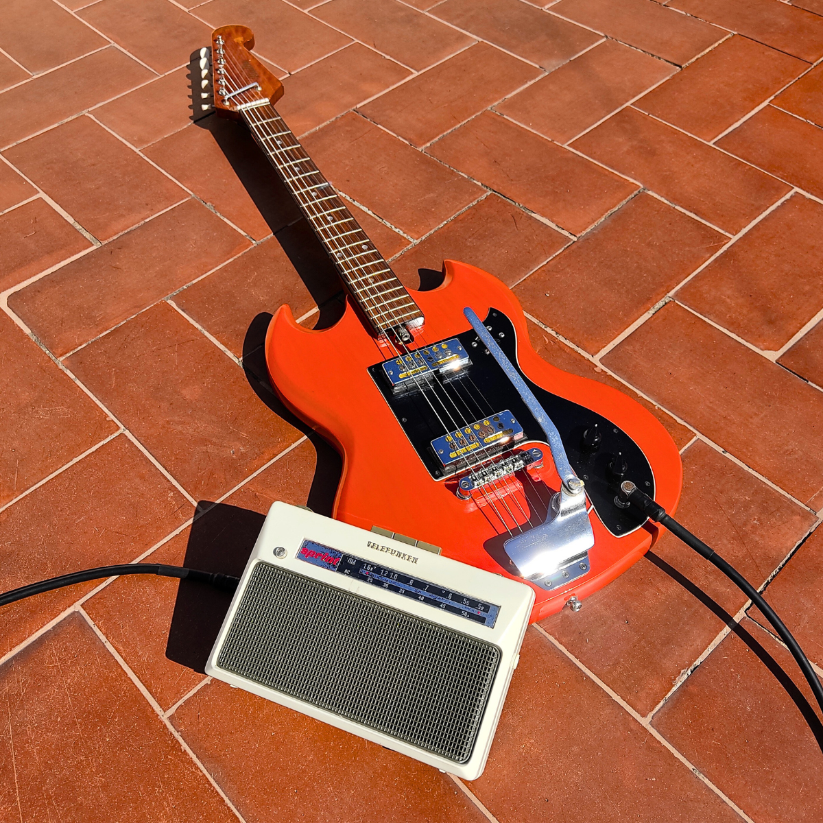 El "Sprinter" es una radio marca Telefunken vintage que ha sido convertida en un tremendo amplificador portátil para guitarra! perfecto para tu estudio de grabación, para ampli de práctica, incluso para un bolo! (debidamente microfoneado, vamos!) Tiene control de volumen en la parte superior que a su vez actúa como switch on/off, y a la derecha está el control de ganancia.