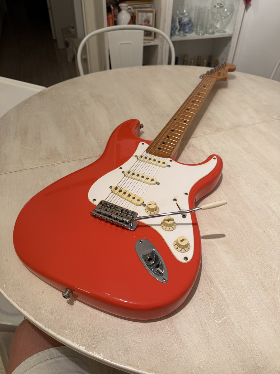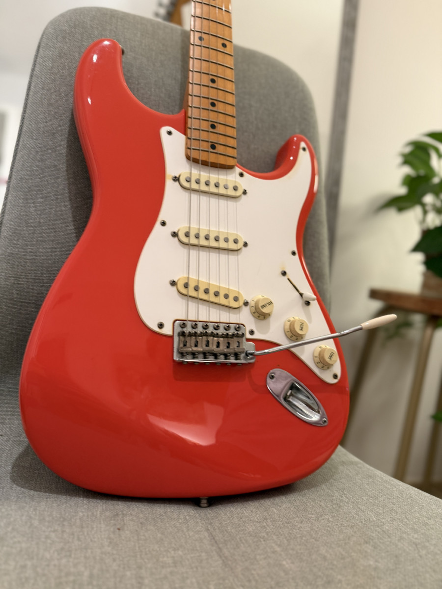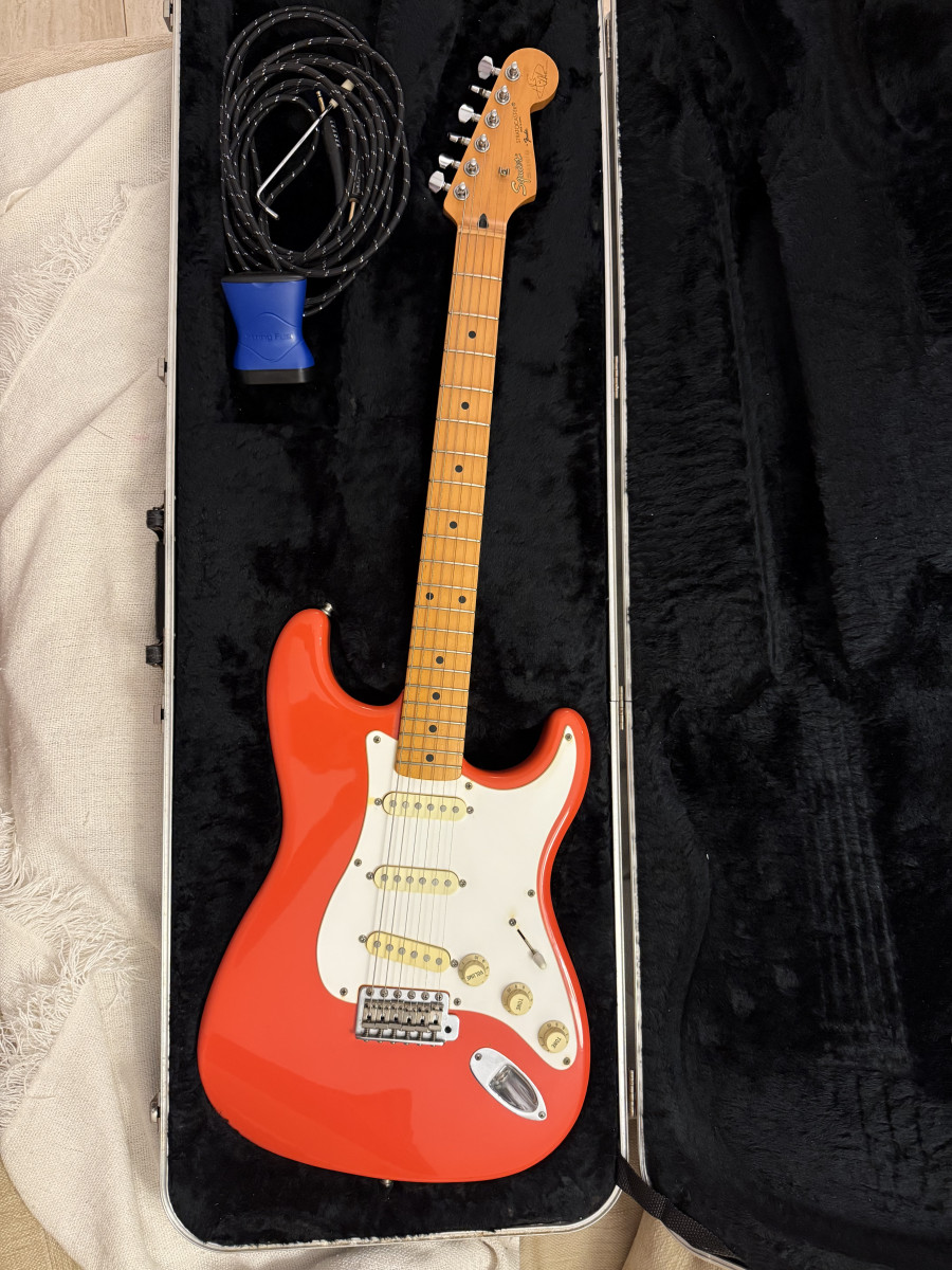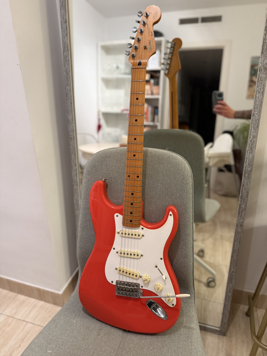 Vendo Squier by Fender Hank Marvin del 1991 made in Japan en color Fiesta red. La guitarra suena de cojones y tiene un tacto brutal. Tiene sus toques superficiales, sobretodo en la parte de abajo. Viene con estuche rígido Fender USA de la época.