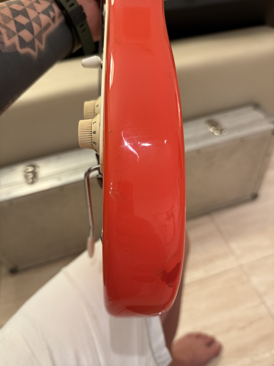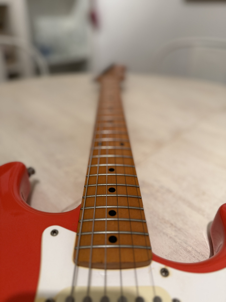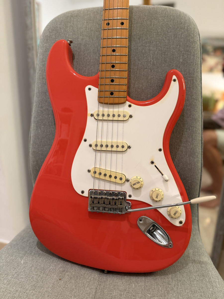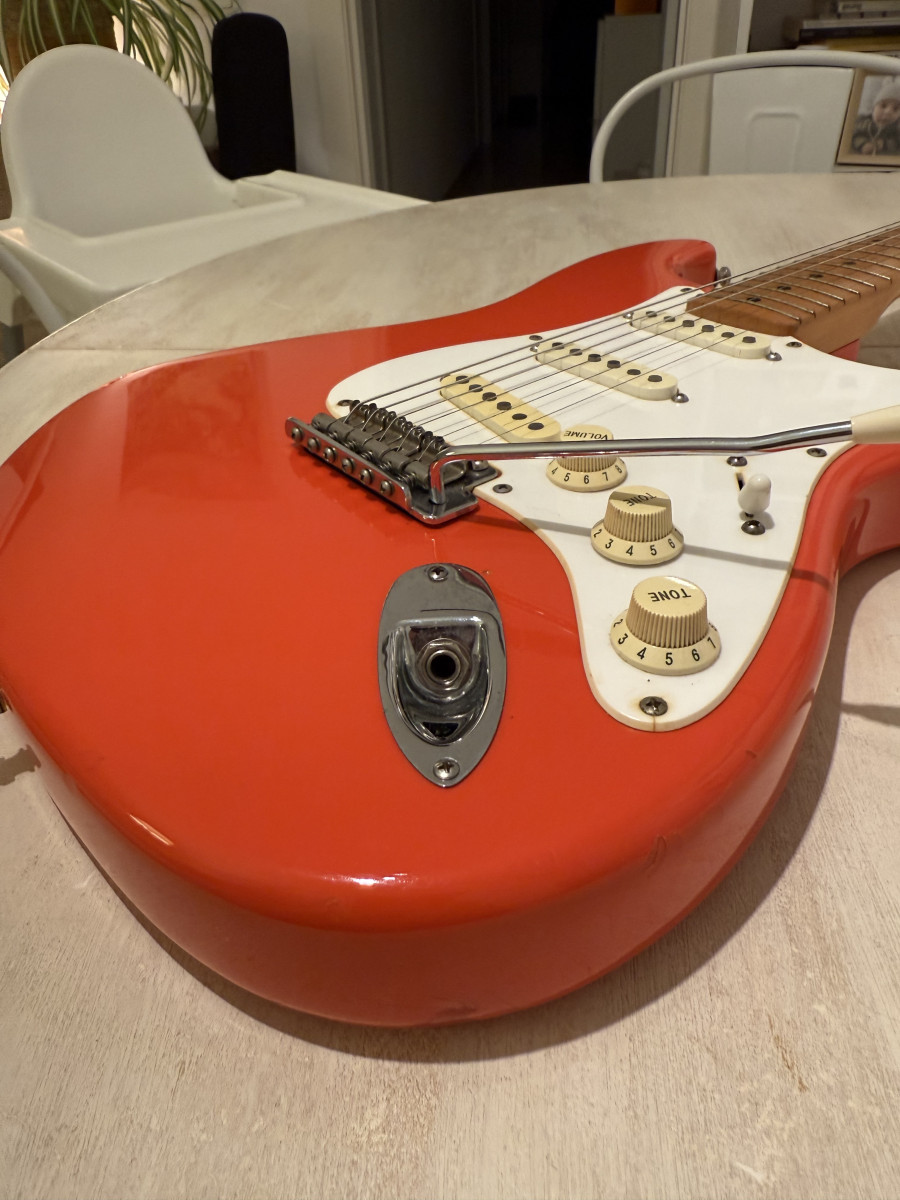 Vendo Squier by Fender Hank Marvin del 1991 made in Japan en color Fiesta red. La guitarra suena de cojones y tiene un tacto brutal. Tiene sus toques superficiales, sobretodo en la parte de abajo. Viene con estuche rígido Fender USA de la época.